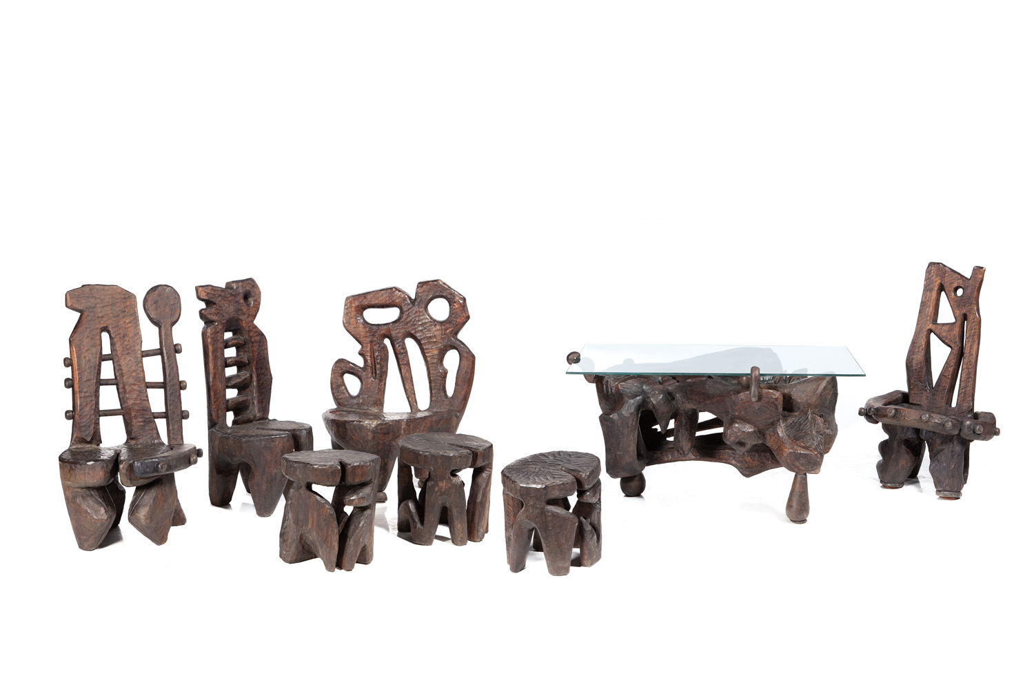 drewno lakierowane, w skład zestawu wchodzi: stół (66 x 124 x 74 cm), cztery krzesła (95 x 63 x 53 cm, 94 x 44 x 49 cm, 95 x 56 x 60 cm, 99 x 64 x 56 cm) oraz trzy taborety (37 x 38 x 34 cm, 38 x 39 x 32 cm, 40 x 36,5 x 33 cm)