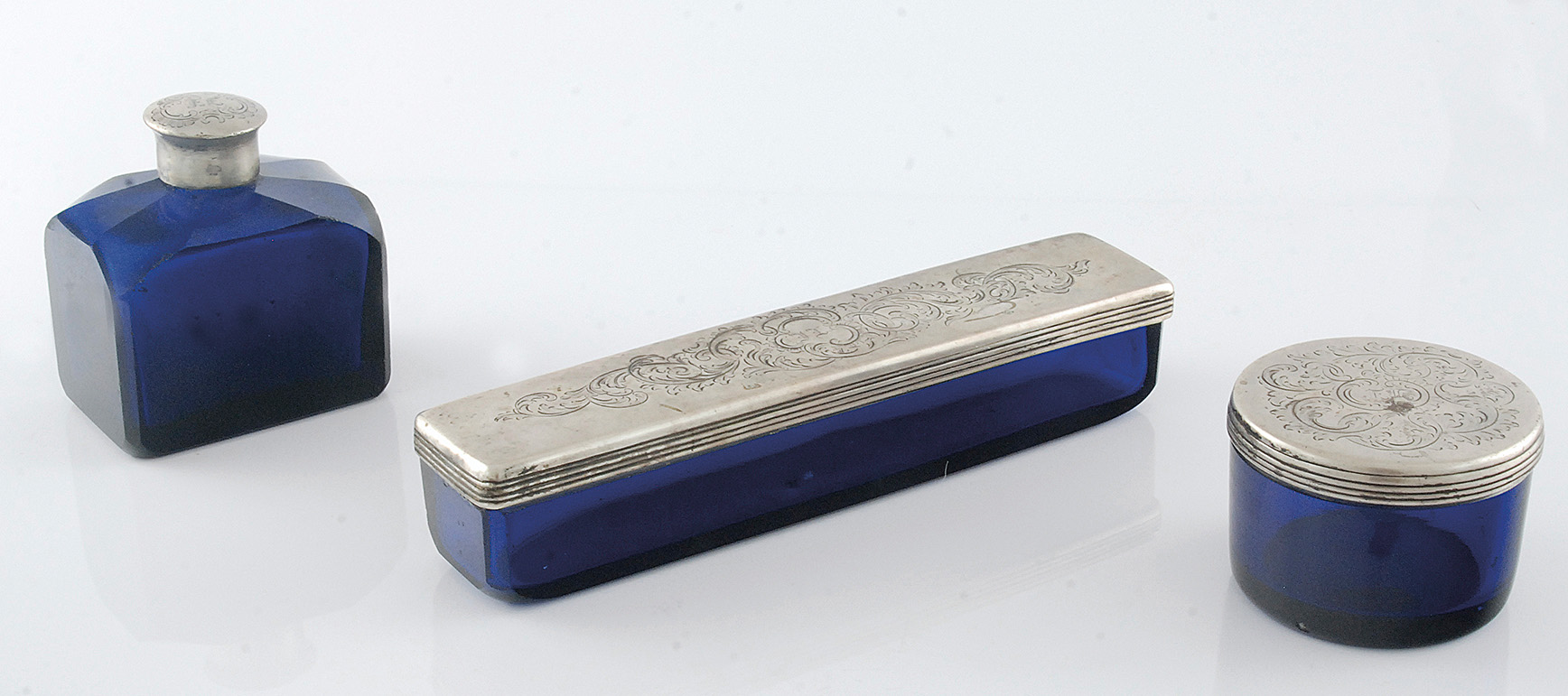 Ze szkła kobaltowego składający się z flakonu prostokątnego, fasetowanego, z krótką wąską szyjką z nakrętką srebrną? (niecechowana), słoiczka cylindrycznego i podłużnego pojemnika z wieczkami srebrnymi; wszystkie elementy metalowe dekorowane grawerowanymi liśćmi akantu i ceownikami z kogucimi grzebieniami, z rezerwą pośrodku, w której grawerowany monogram gotycki EE?;