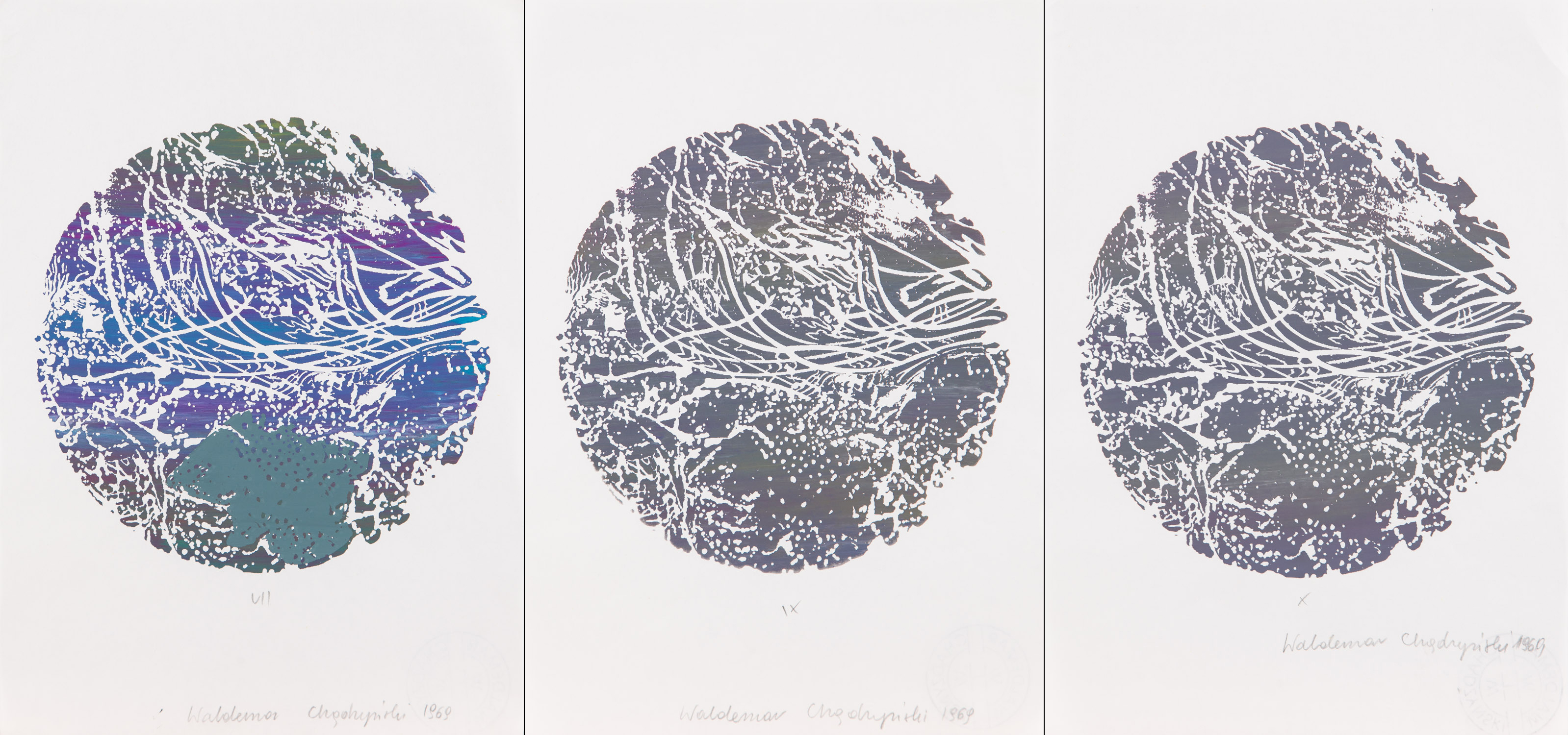 sitodruk barwny, papier, 29,5 x 21 cm (wymiary każdego arkusza);opisane numerami VII, IX, X, sygn. i dat. p. d.: Waldemar Chądzyński 1969;bez oprawy
