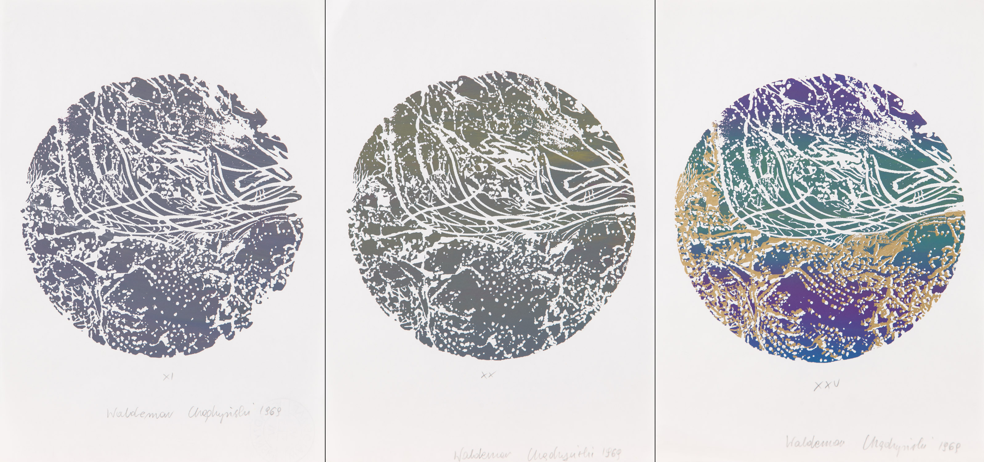 sitodruk barwny, papier, 29,5 x 21 cm (wymiary każdego arkusza);opisane numerami XI, XX, XXV;sygn. i dat. p. d.: Waldemar Chądzyński 1969;bez oprawy