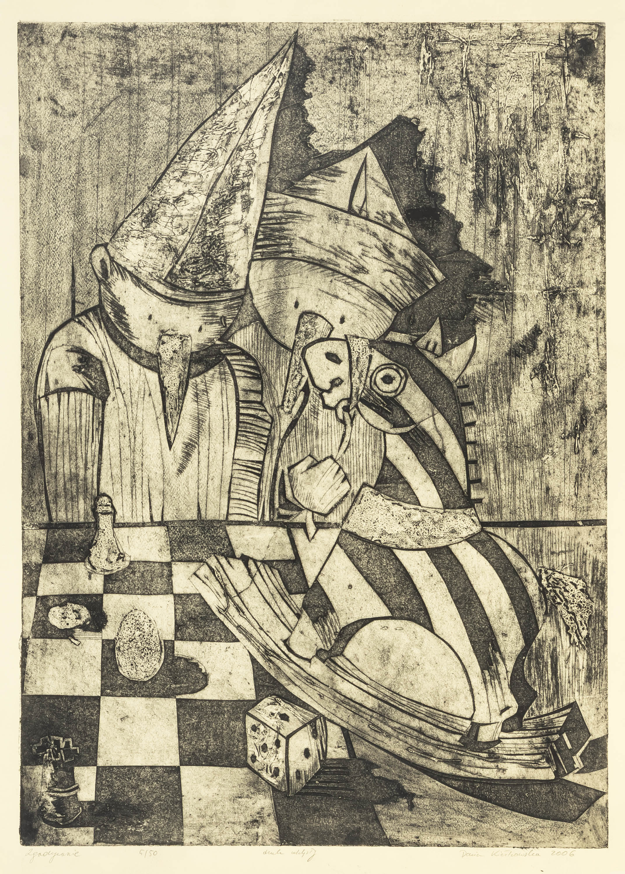 druk wypukły, papier, 69 x 49 cm (zadruk),sygn. i dat. p.d.: Daria Kiełkowska 2006, opisany l.d.: Zgadywanie, 5/50