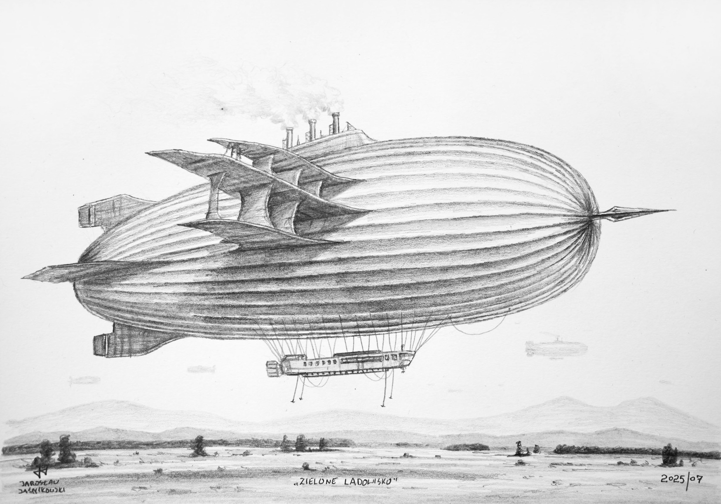 ołówek na papierze, 21 cm x 15 cm;sygn. w kompozycji, l.d.: J.J. JAROSŁAW JAŚNIKOWSKI;zatytułowany, śr.d.: ''Zielone lądowisko'';datowany, p.d.: 2025 / 07;dołączony certyfikat autorski;rysunek oprawiony
