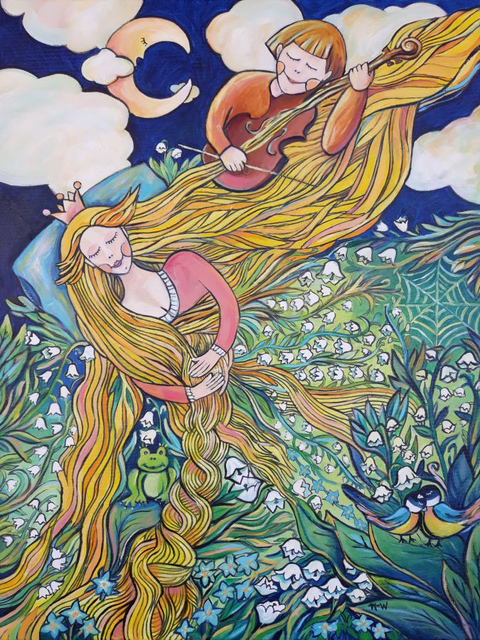 technika mieszana na płótnie, 80 x 60 cmsygnowany p. d. róg: ‘n-w’sygnowany i opisany na odwrociu: ‘Natalia Nasada – Wojtal | „Złotowłosa i Grajek” 2021’