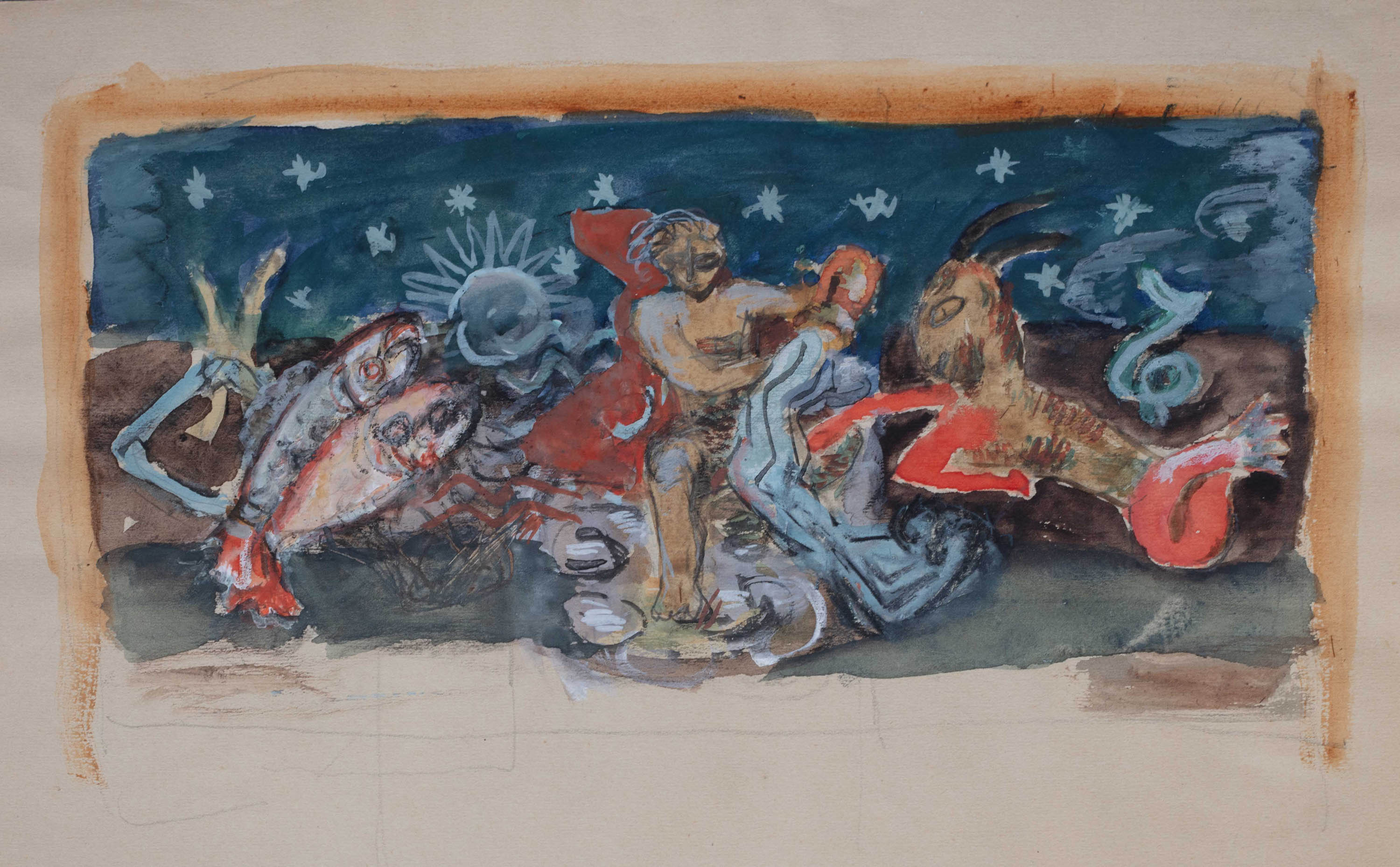 akwarela, gwasz, papier, 14 × 27 cm w świetle passe-partout