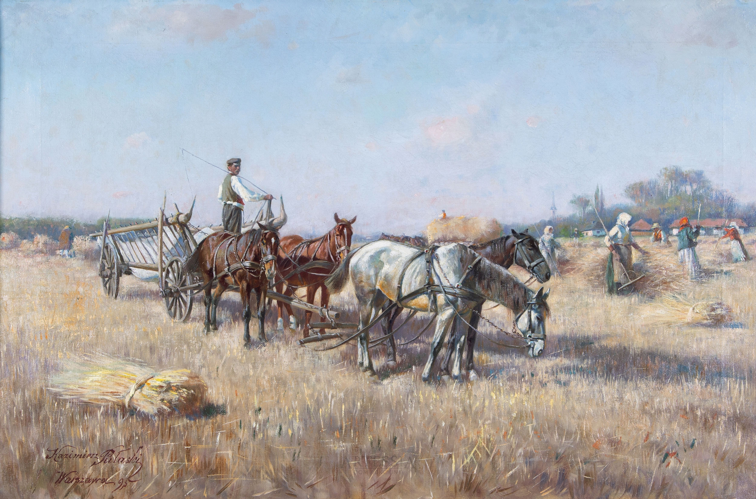 Kazimierz Pułaski to ciekawy artysta, którego dzieła niemal nie pojawiają się na rynku sztuki. Był ciotecznym bratem Wojciecha Kossaka i część dzieciństwa spędził u Kossaków w Krakowie. W 1895 roku Wojciech Kossak zaangażował go w Berlinie do pomocy przy panoramie Berezyna. Obraz Żniwa powstał w tym samym roku, być może podczas wakacji. Pułaski w późniejszym okresie wspierał Wojciecha Kossaka przy malowaniu kolejnych panoram i mniejszych kompozycji.