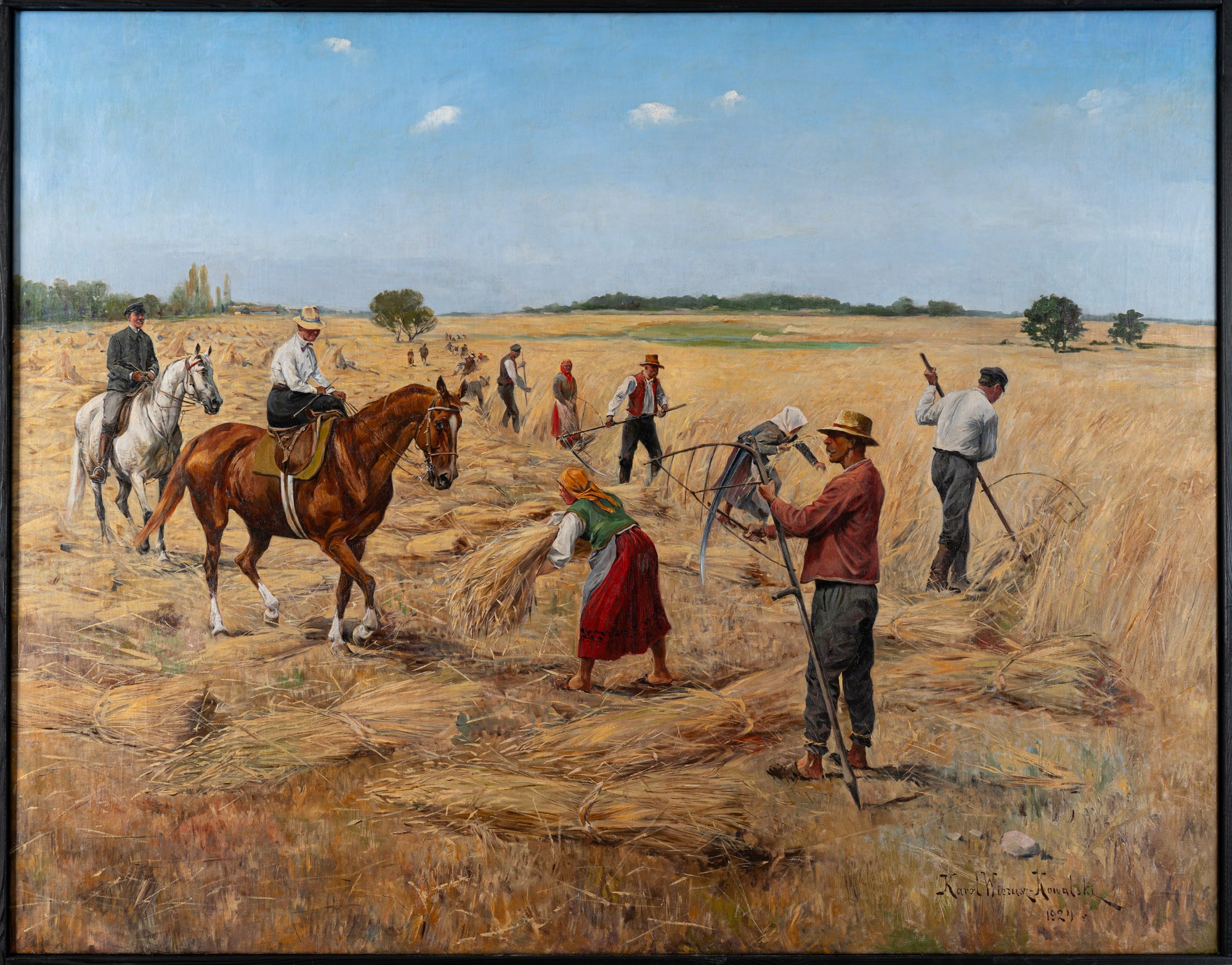 Malarz zbudował kompozycję dzieła z dużą dbałością o detal: od złocistych łan zboża na pierwszym planie, po odległą zieleń drzew na horyzoncie. Znakomicie operując światłem, dobrze oddał klimat typowy dla pogodnego, letniego dnia, kontrastując go z ciemniejszymi akcentami kolorystycznymi strojów i sylwetek koni. Artysta wiernie przedstawił dwa wierzchowce, które stanowią istotny akcent kompozycyjny. Duży format dzieła pozwolił na stworzenie panoramicznego widoku, który doskonale pokazuje zarówno pierwszy plan z grupą żniwiarzy, jak i dalsze - z szeregiem malejących postaci pochylonych nad łanami. W efekcie obraz zyskuje na dekoracyjności i jest szczególnie atrakcyjny dla kolekcjonerów.