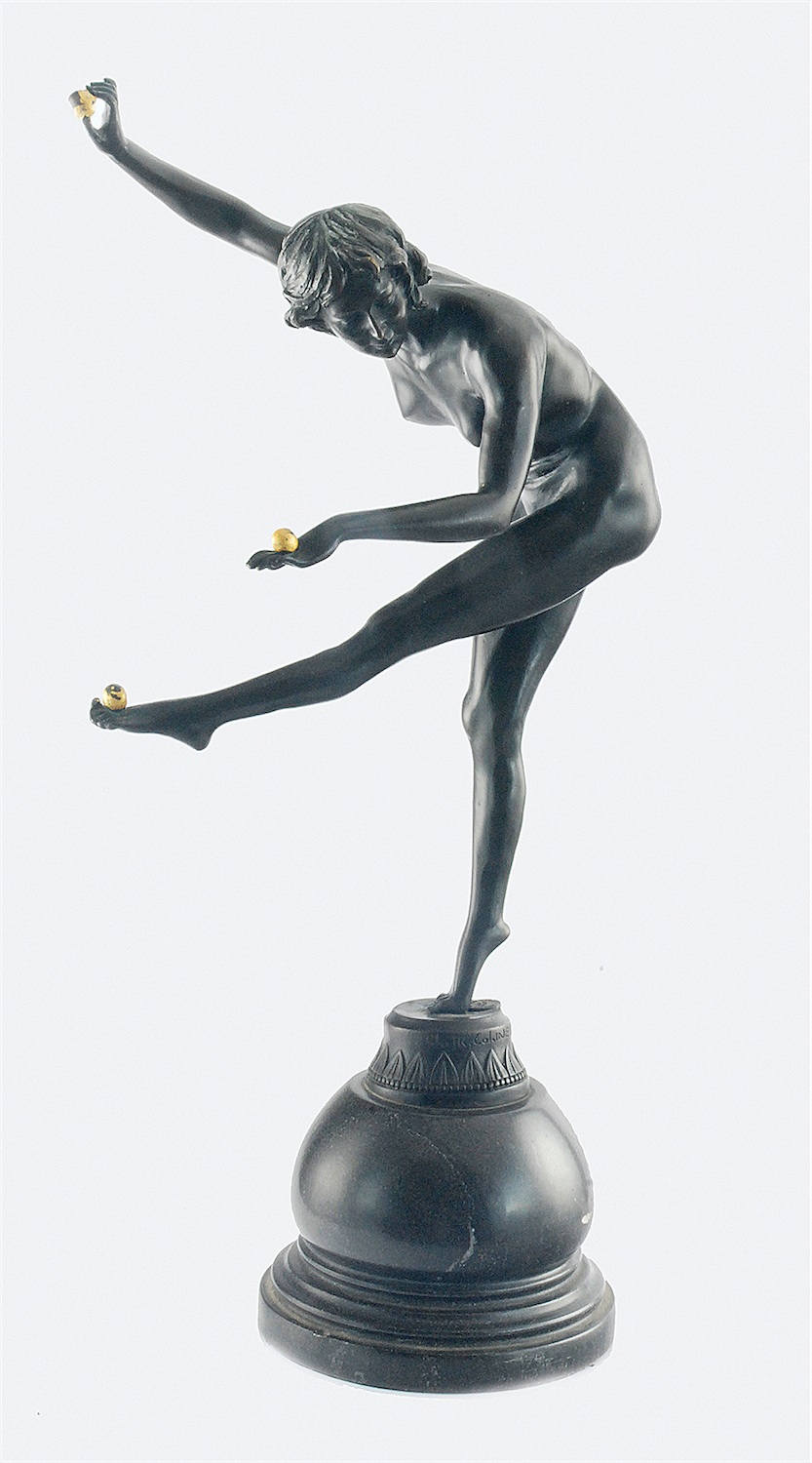Figura nagiej dziewczyny - cyrkowej akrobatki - żonglującej złotymi piłeczkami. Podstawa z szaroczarnego, polerowanego granitu - dołem kolista, profilowana, wyżej w formie spłaszczonej kuli.