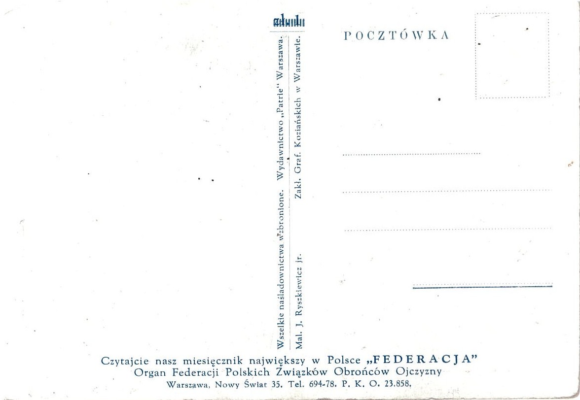 Mal. J. Ryszkiewicz jr. Zakł. Graf. Koziańskich w Warszawie. Wszelkie naśladownictwo wzbronione. Wydawnictwo "Patrie" Warszawa.