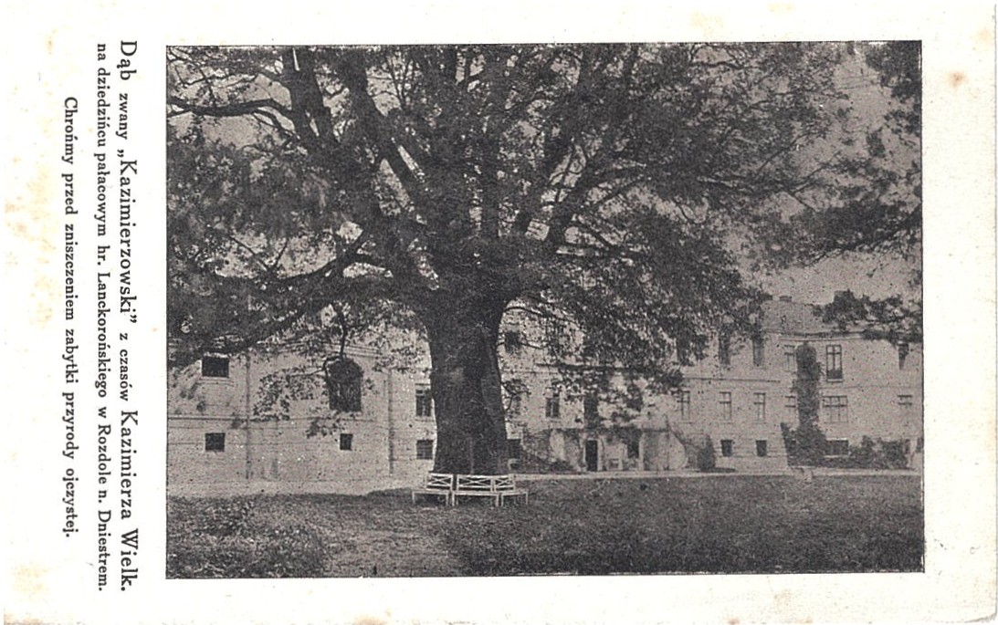 Dąb zwany "Kazimierzowski" z czasów Kazimierza Wielk. na dziedzińcu pałacowym hr. Lanckorońskiego w Rozdole n. Dniestrem. Chrońmy przed zniszczeniem zabytki przyrody ojczystej. Zabytki polskiej przyrody. Serja...