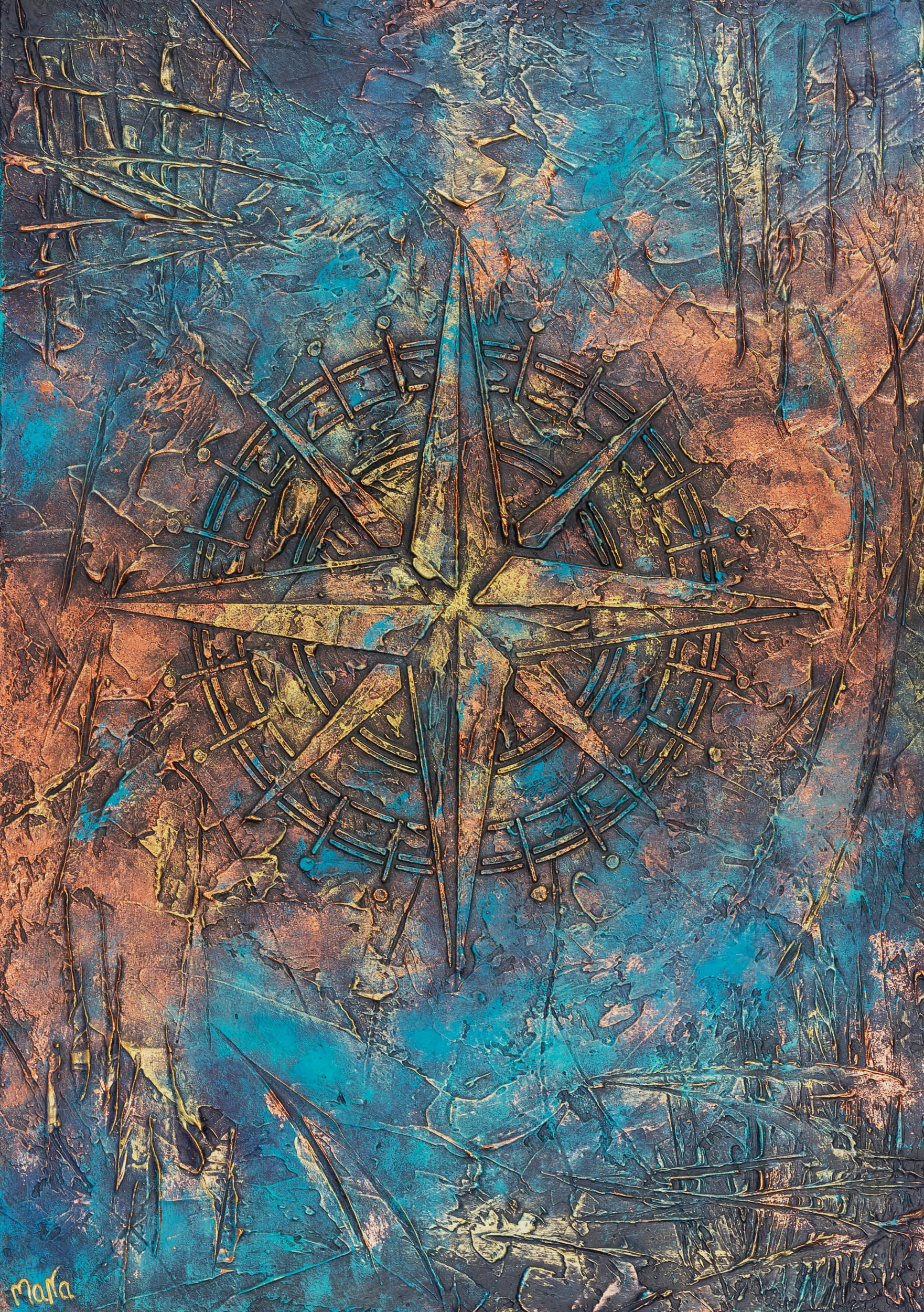sygnowany p.d.: 'J.MAZUR ' oraz opisany na odwrocie: '"Seven Seas" 100 x 80 | Justyna Mazur | Design | 2025 r. | [monogram artystki JM] '