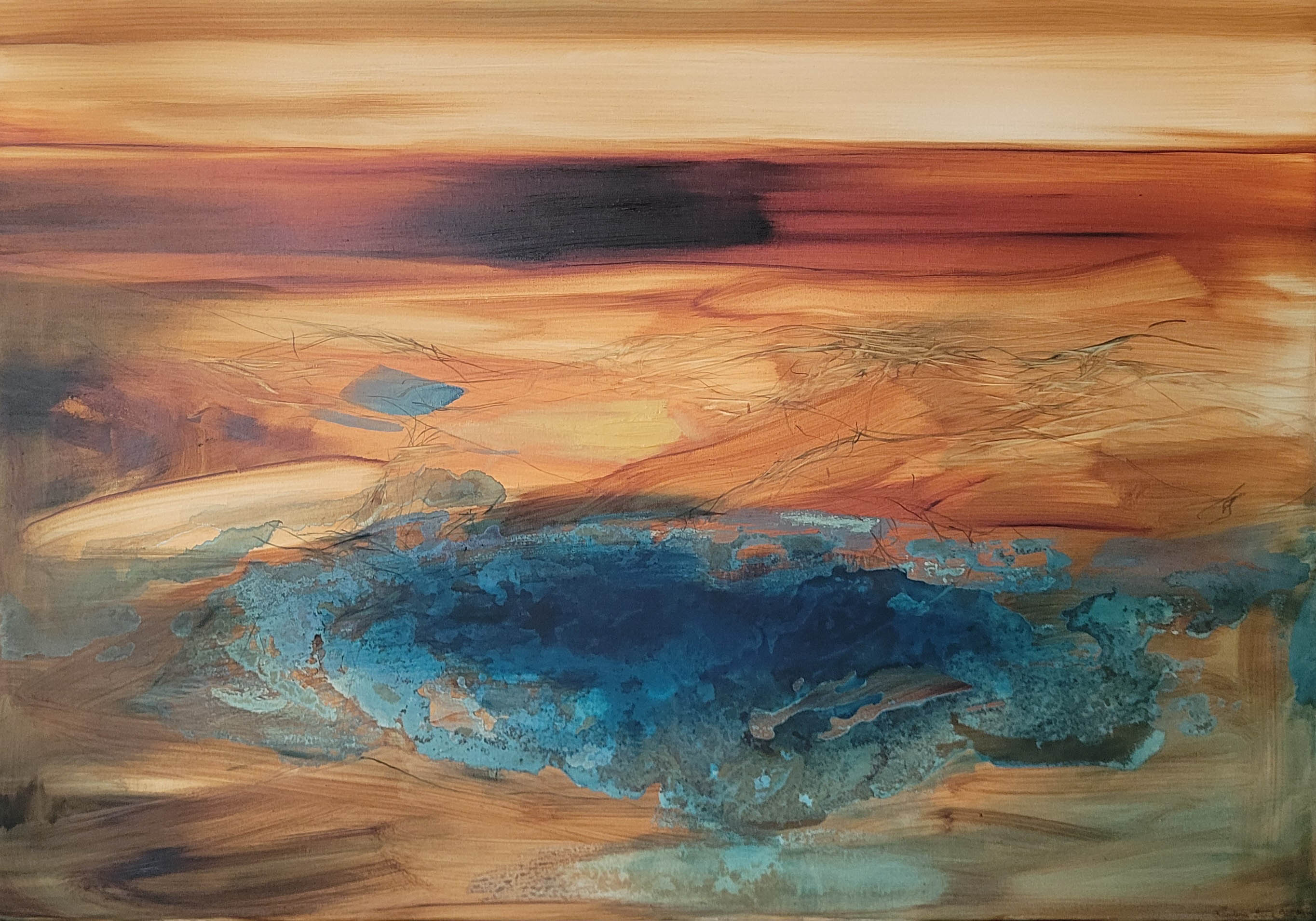 akryl na płótnie, 50 x 70 cm, oprawiony przez autora, 57,2 x 77,2 cm wraz z oprawą,