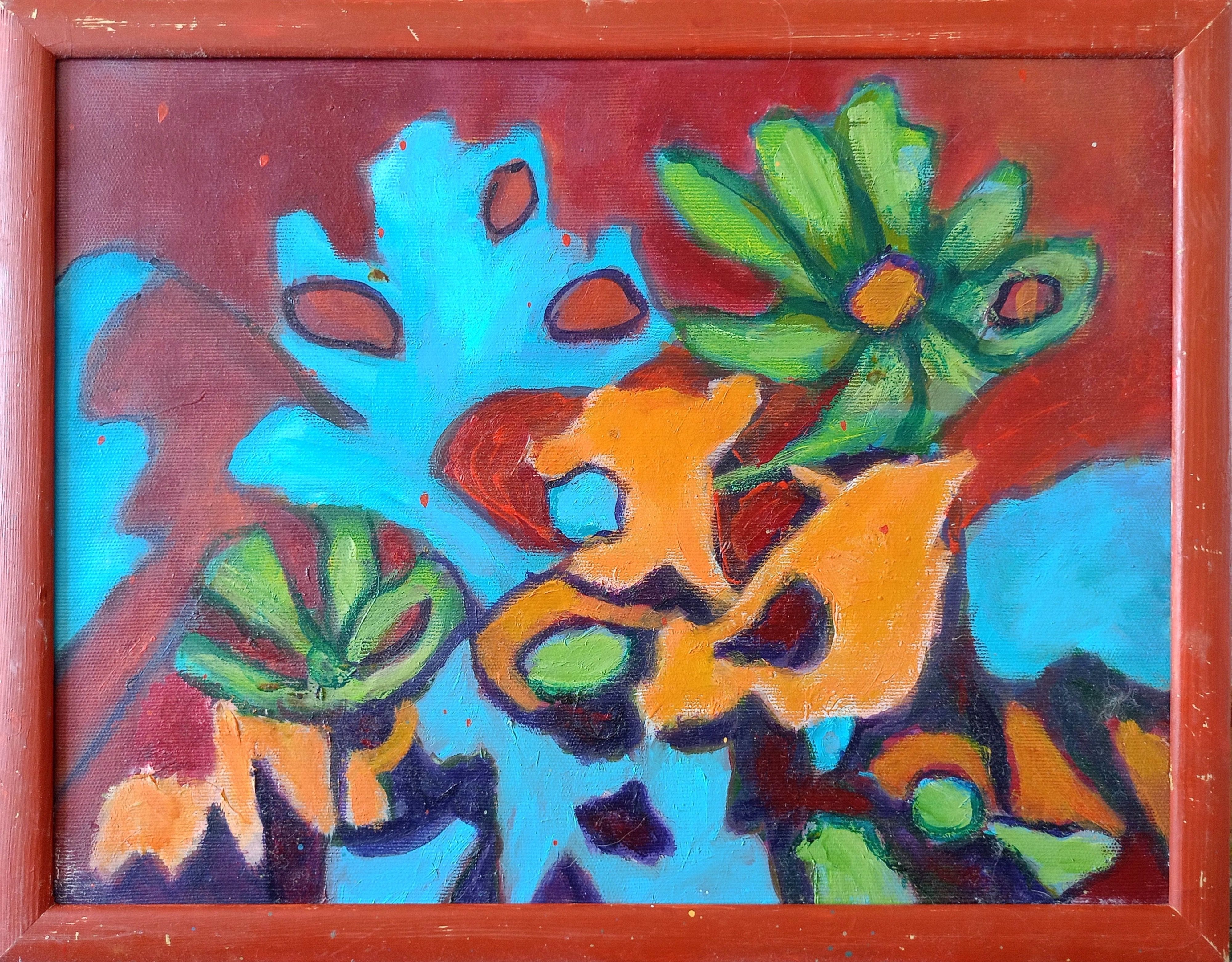akryl na kartonie, 15 x 15 cm, 17 x 17 cm razem z oprawą,
