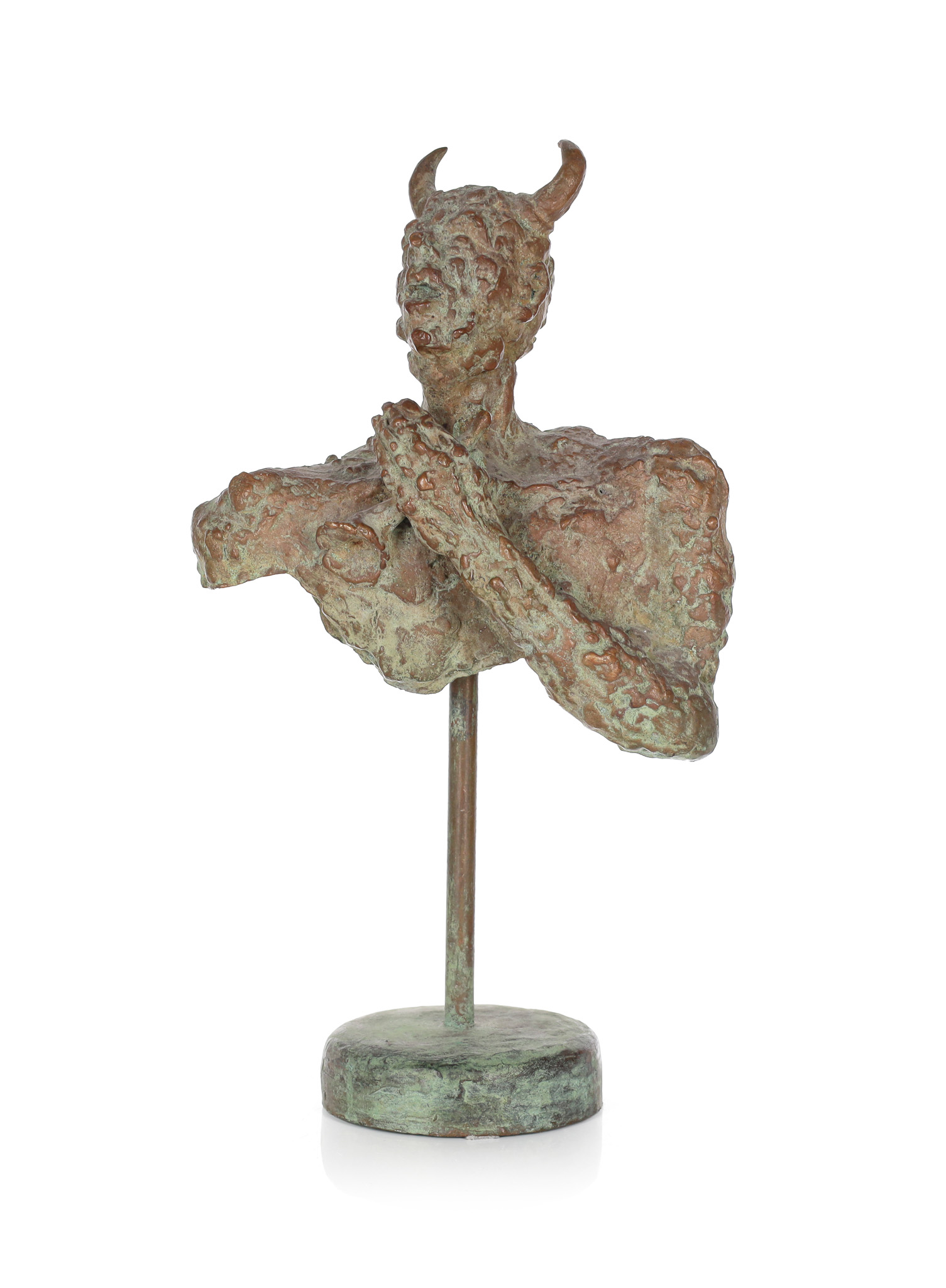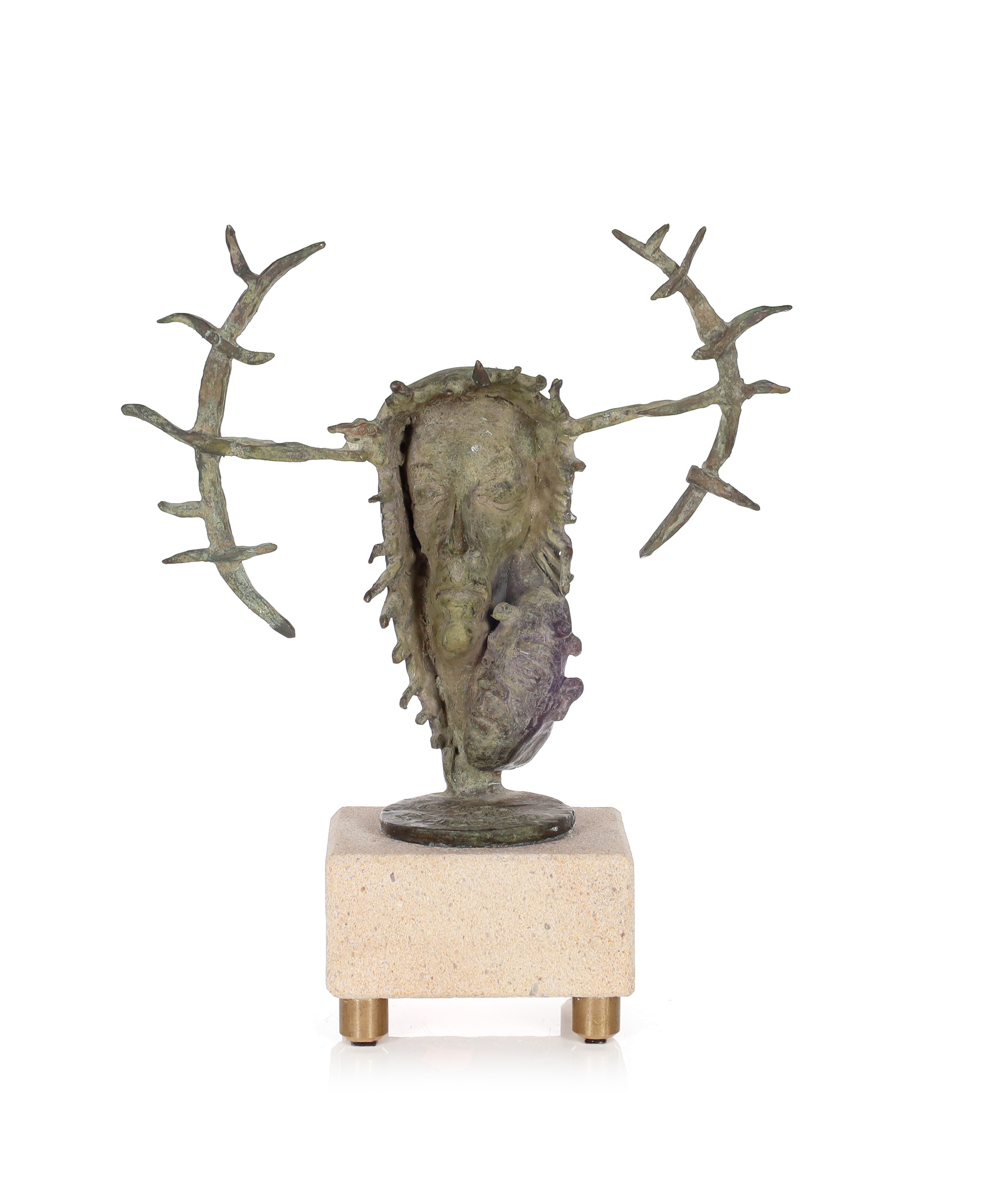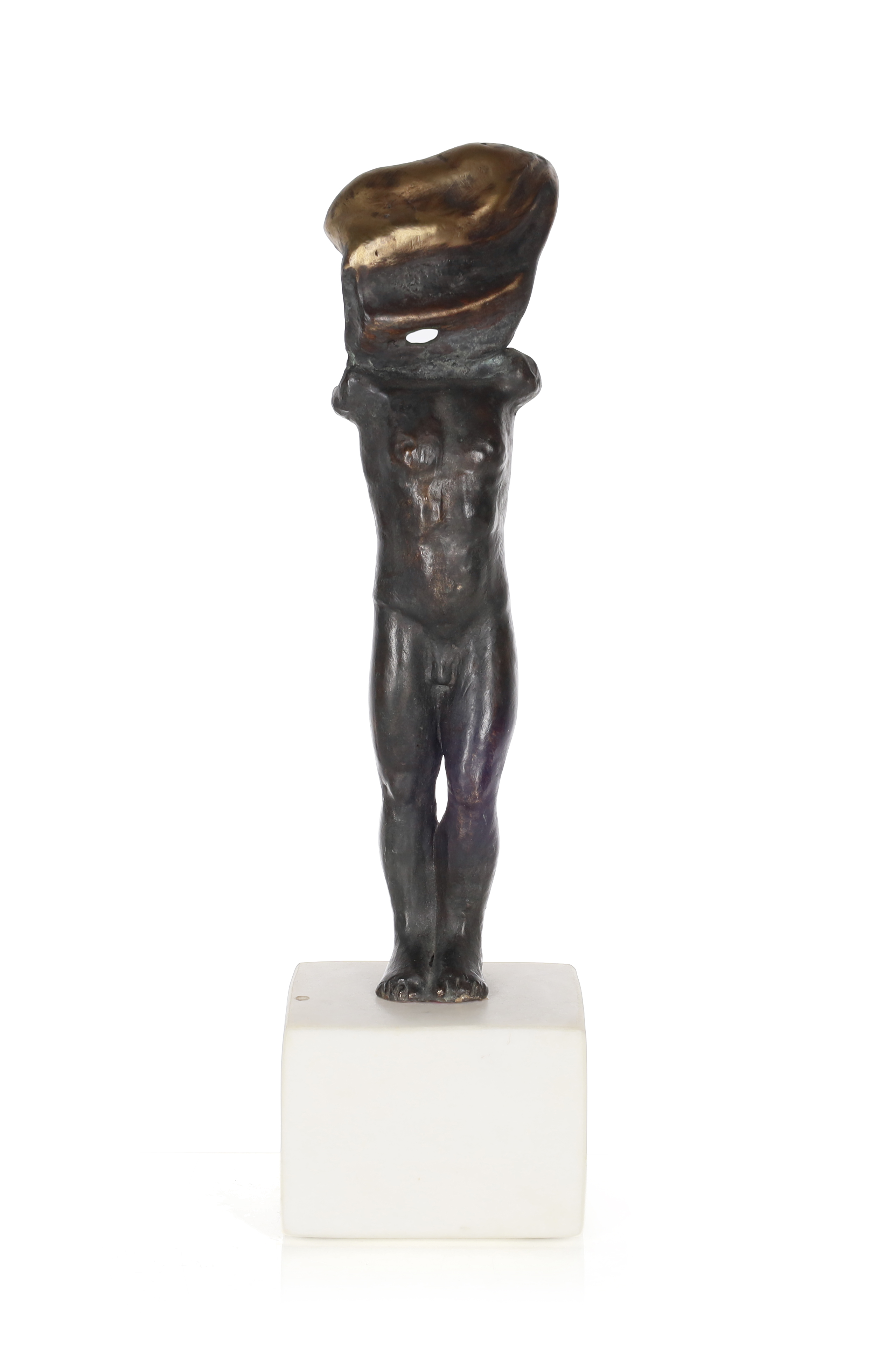 brąz patynowany na kamiennej podstawie, wys. całkowita: 23,5 cm, 18 cm (rzeźba) x 27 x 22 cm,