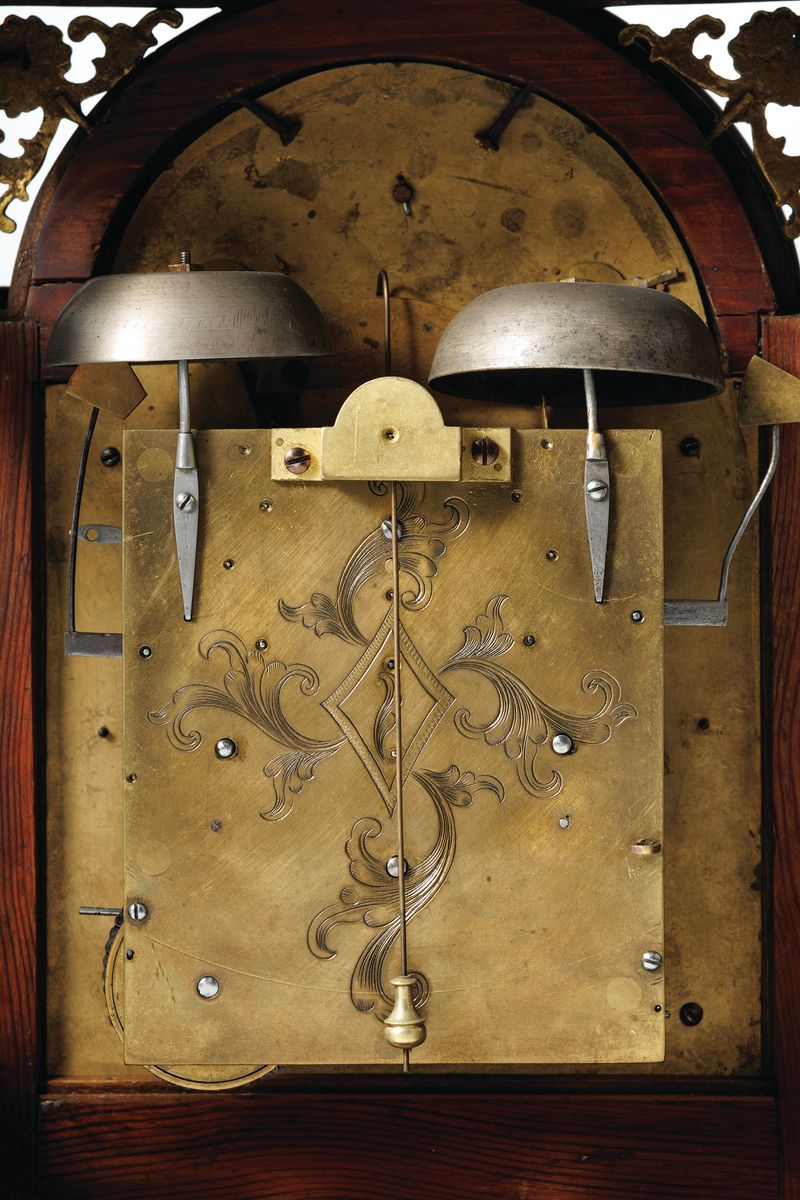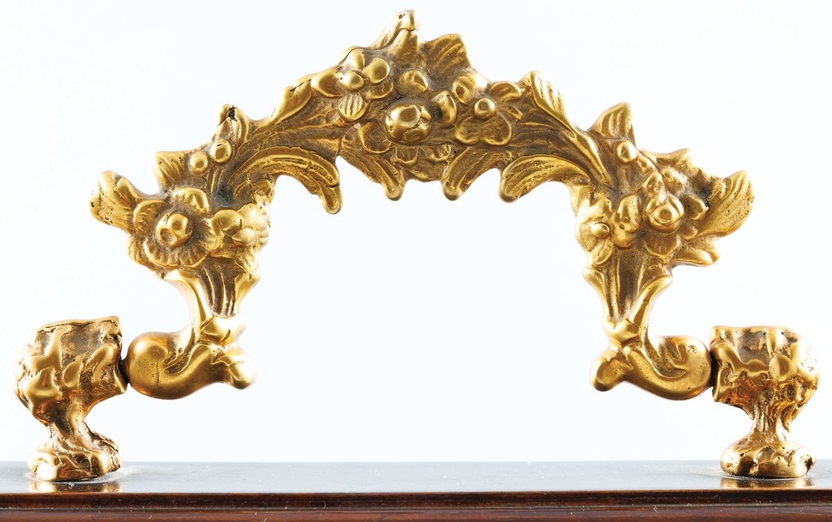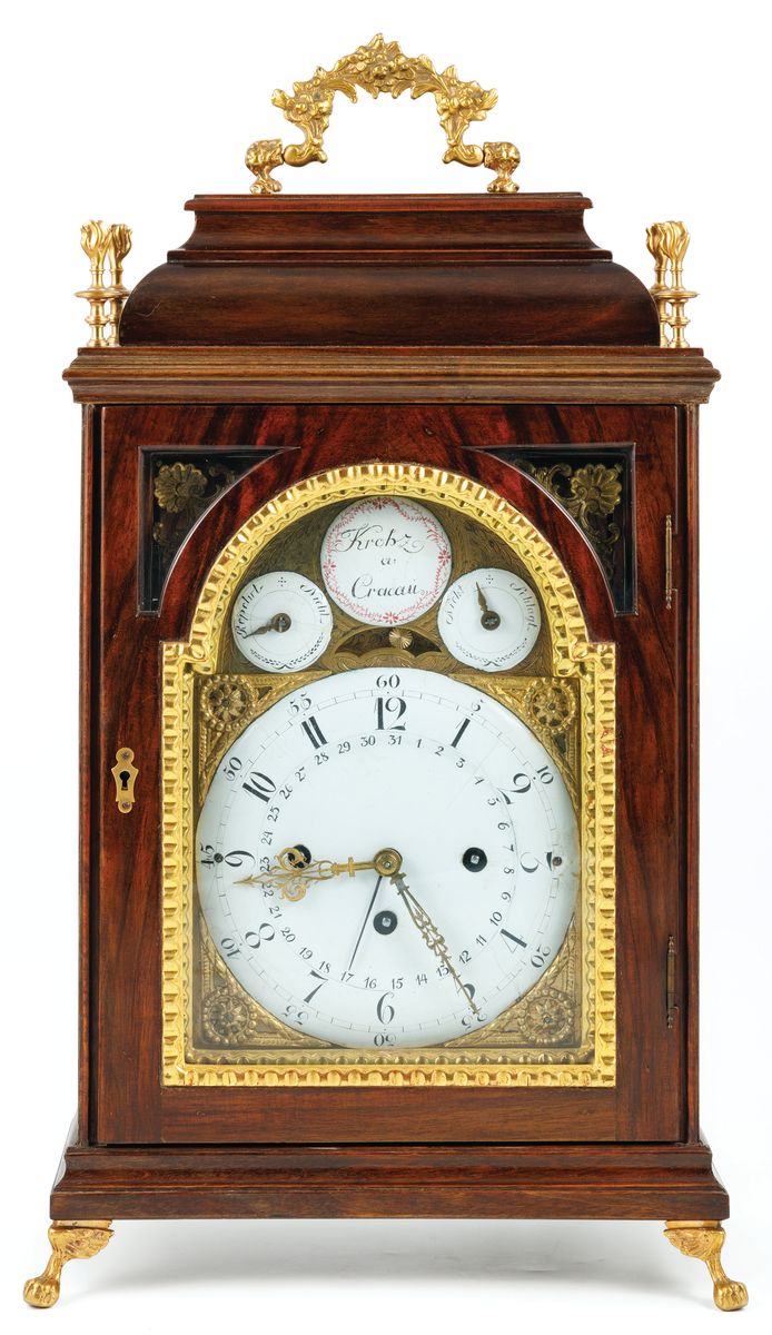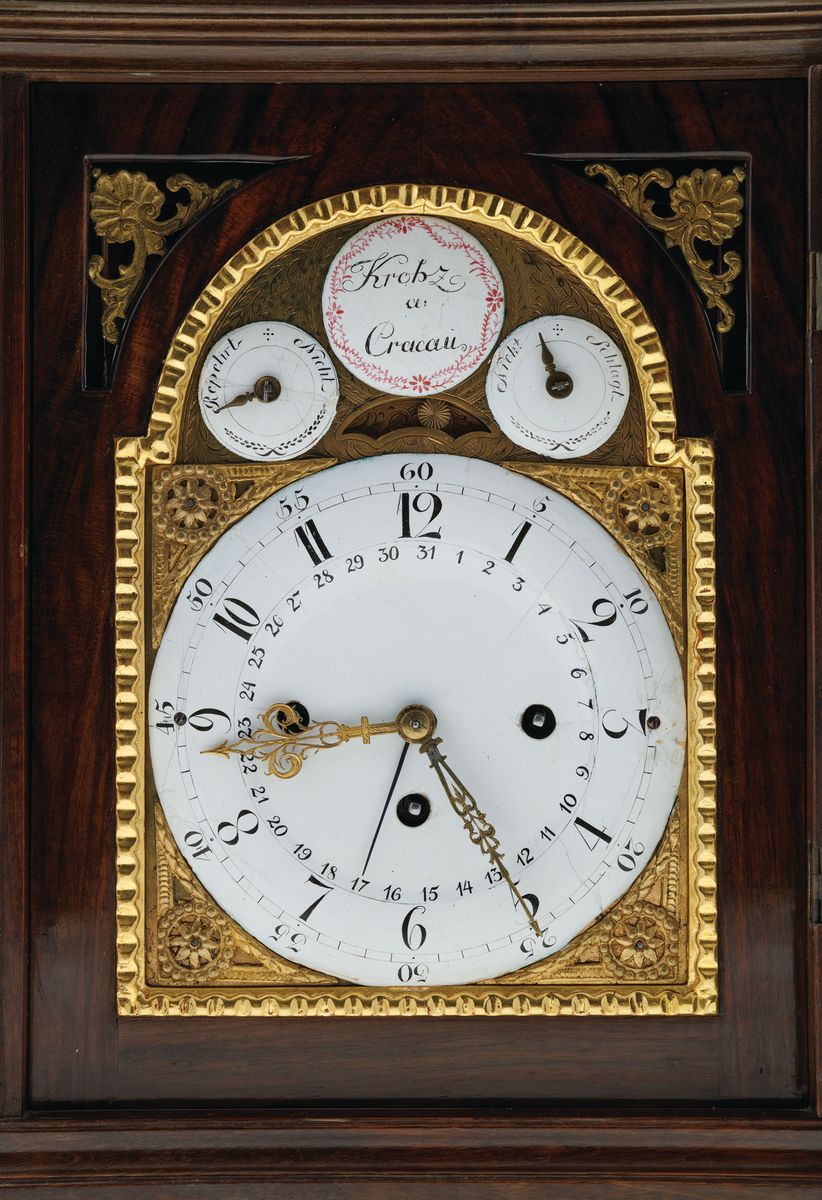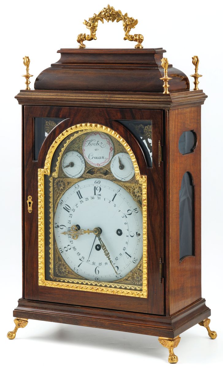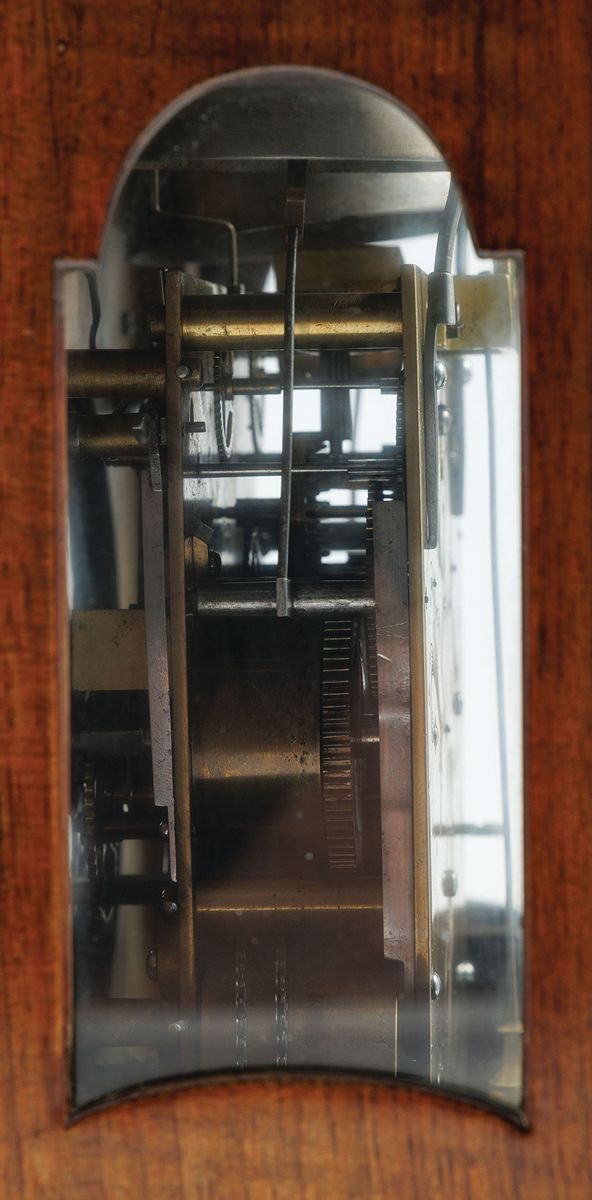 Obudowa drewniana, przeszklona, aplikacje brąz złocony, wys. 54 cm, tarcze emaliowane. Mechanizm o naciągu sprężynowym, regulatorze wahadłowym z bębnem wyrównawczym i łańcuszkiem Galla, dwa dzwonki, system bicia paryski,...