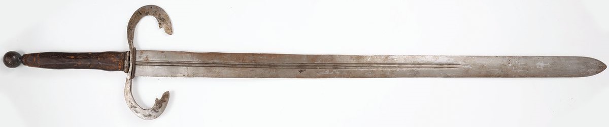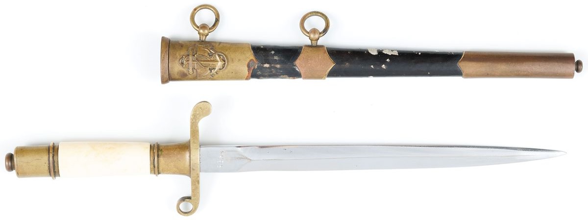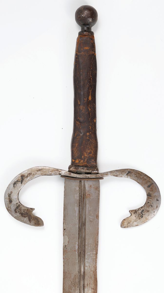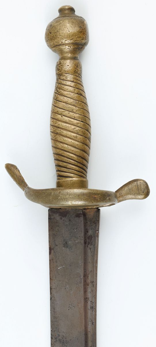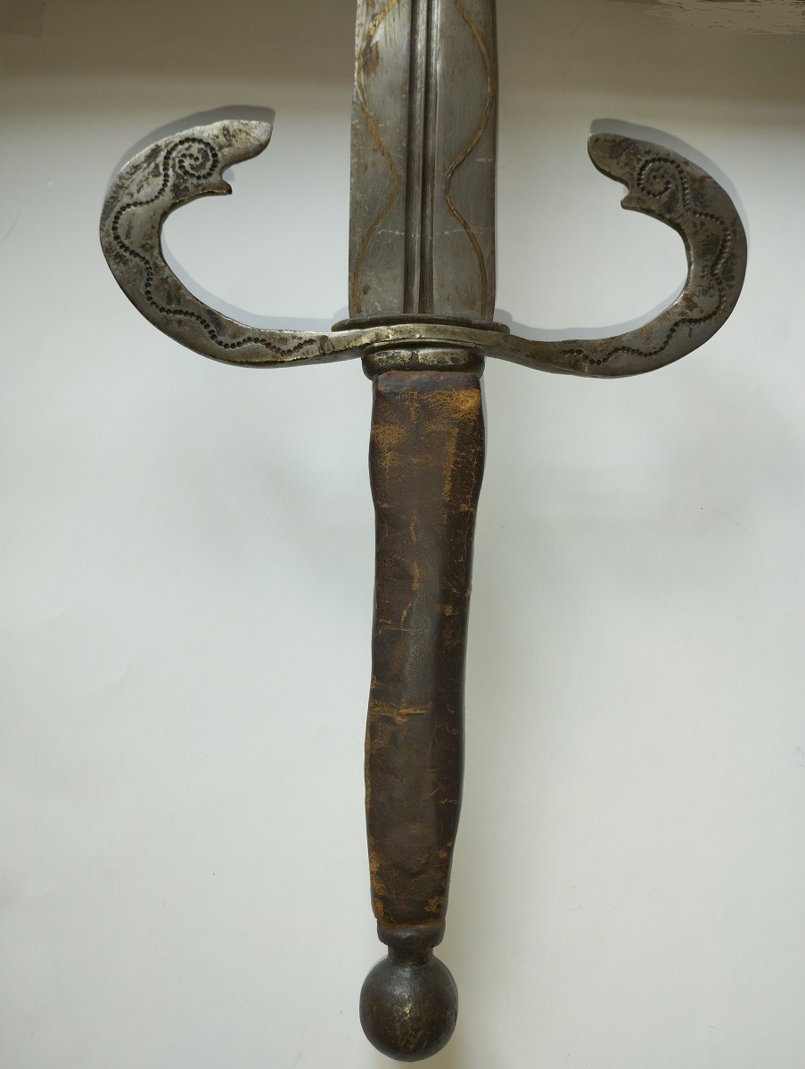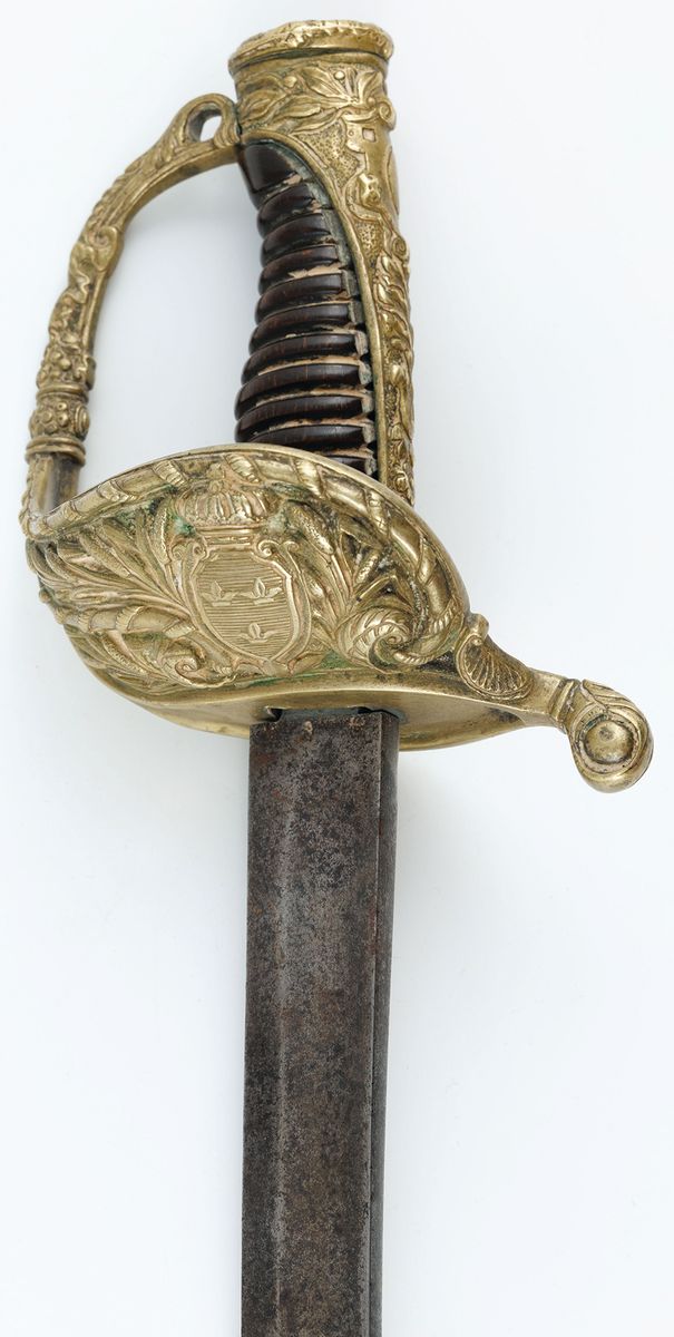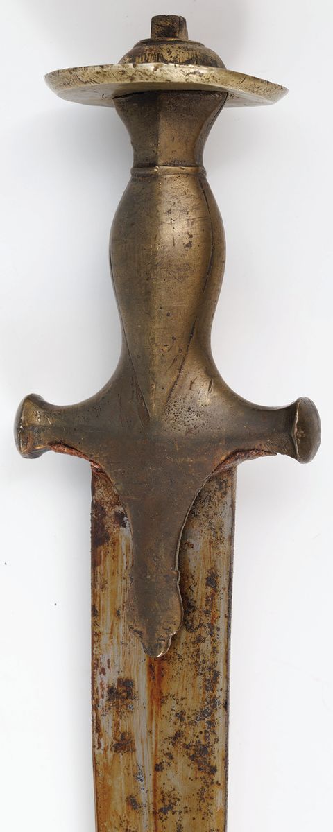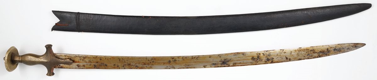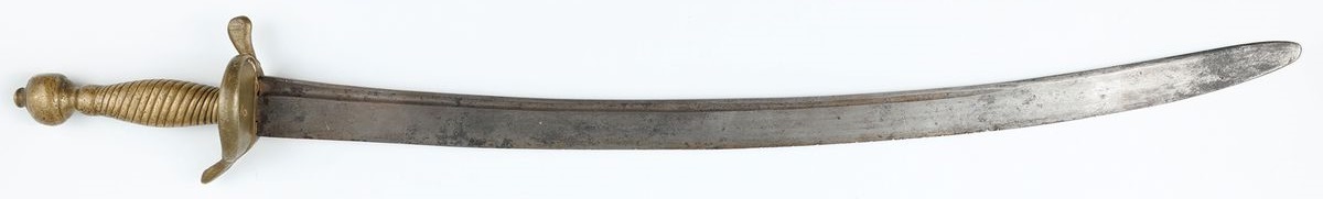 Stal, brąz, skóra, dł. cłk. W pochwie 91 cm, bez pochwy 89 cm, głowni 77,5 cm