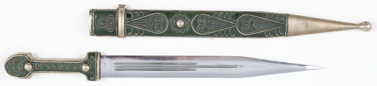Stal, biały metal, zielony lakier, dł. cłk. w pochwie 50 cm