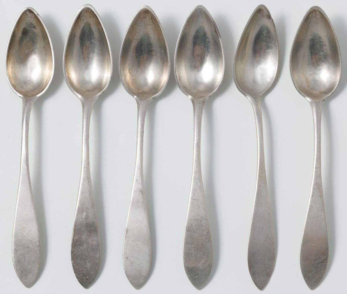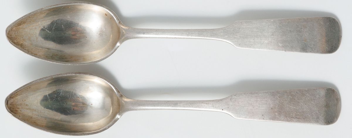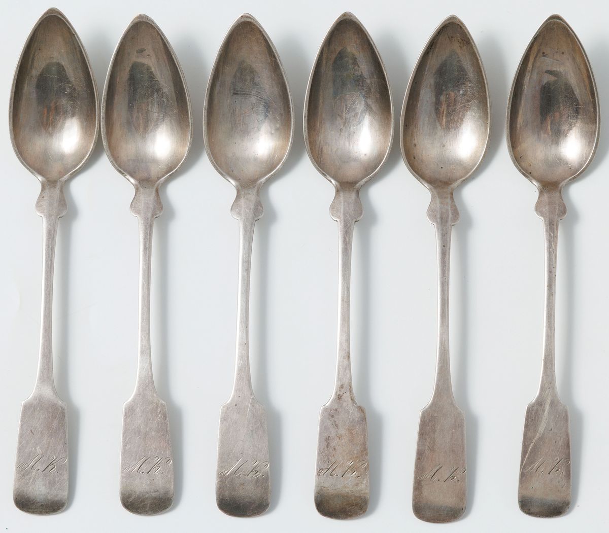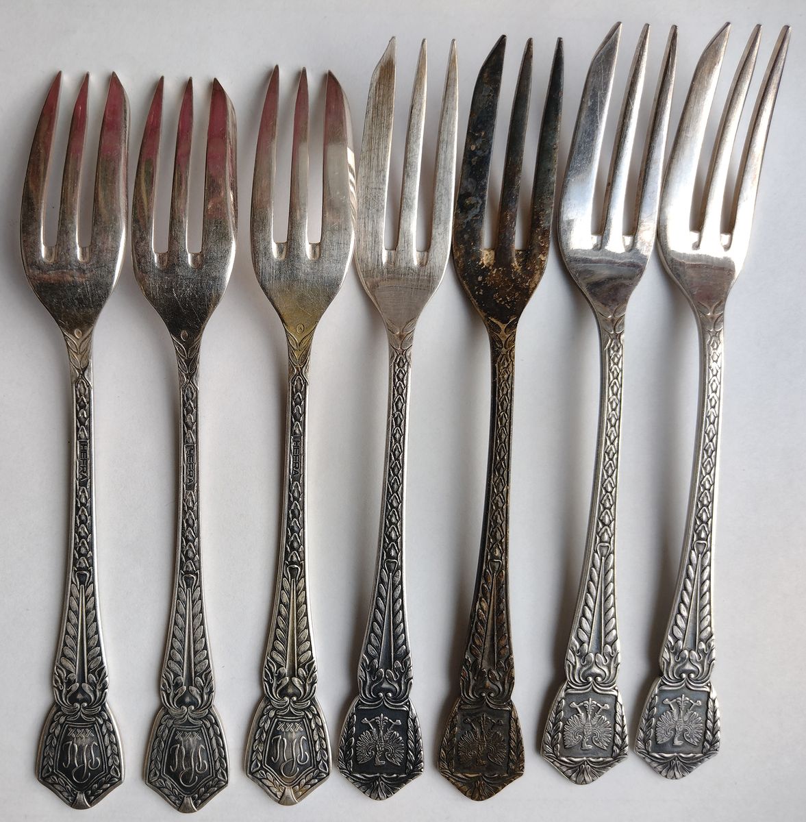 Srebro, próba 3, waga 183,9 g, dł. 14,5 cm, 7 widelczyków do ciasta