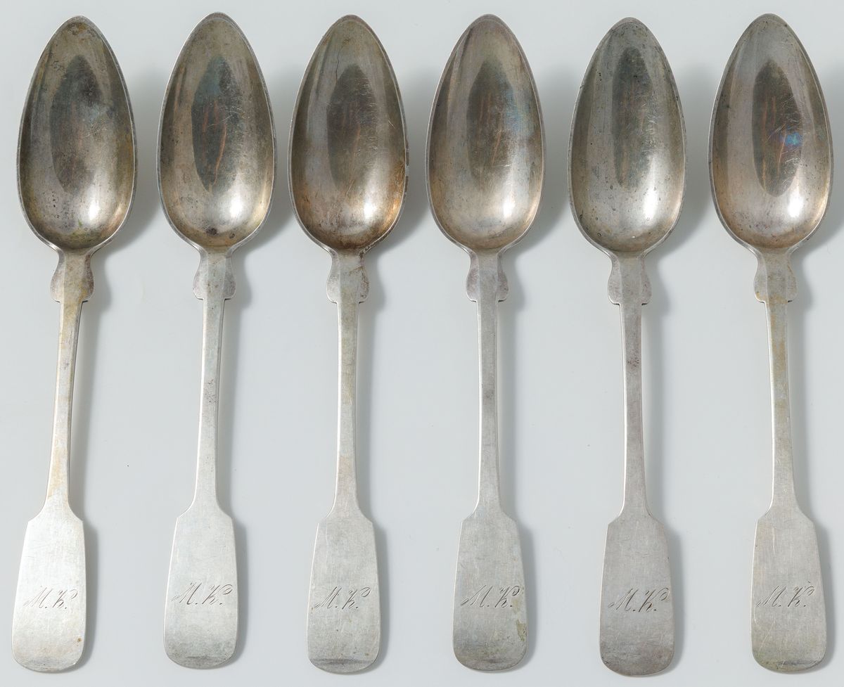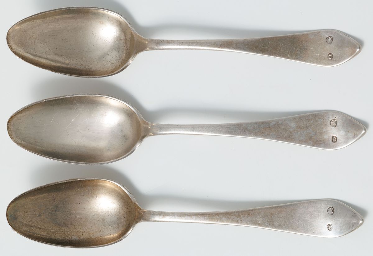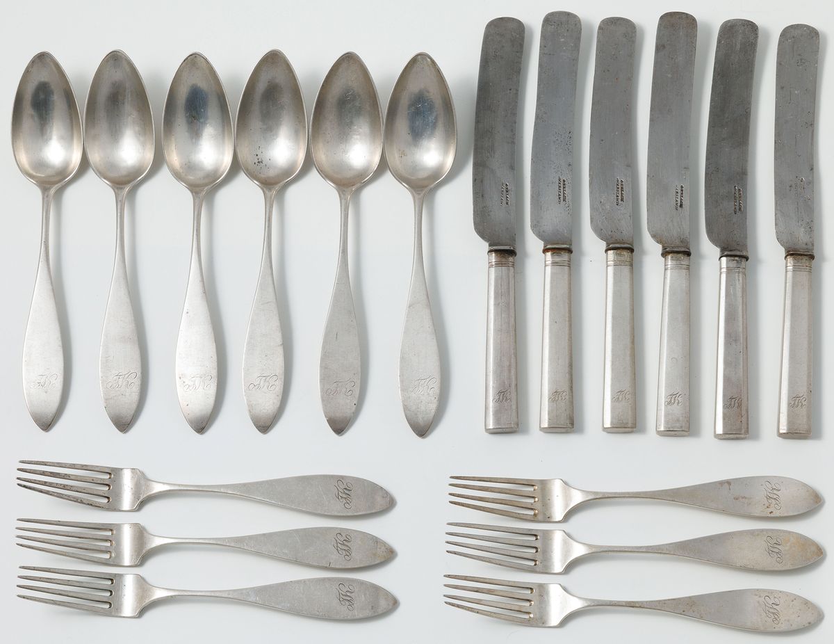 Srebro, pr. 12, stal (ostrza noży), waga bez noży 846 g; w składzie po 6 łyżek 23 cm, widelców 22 cm, noży 26 cm, razem 18 sztuk