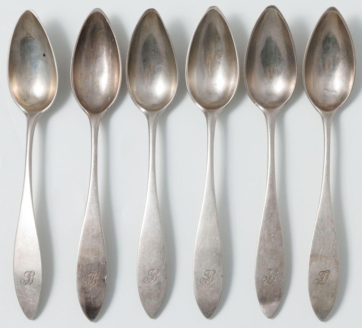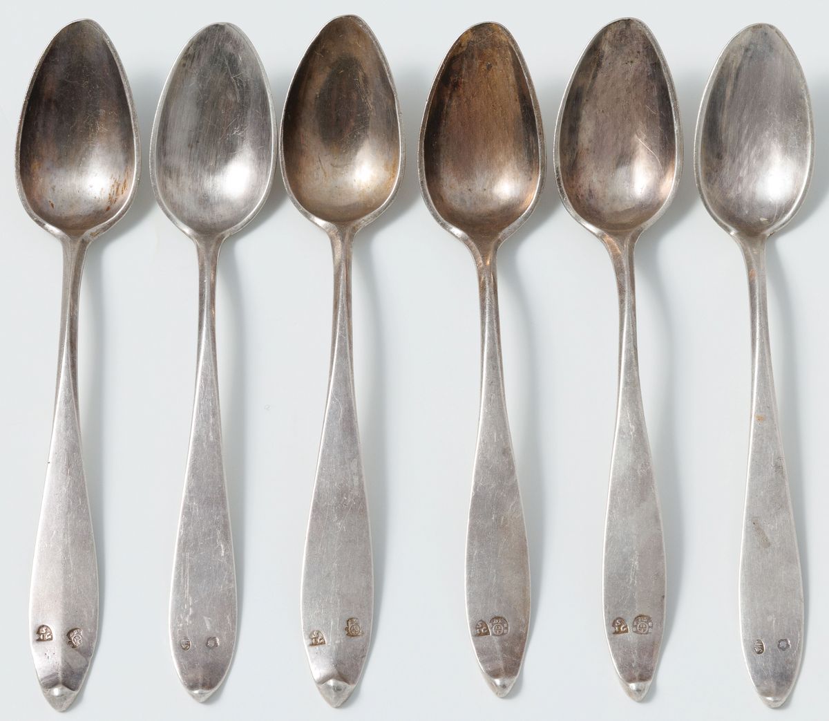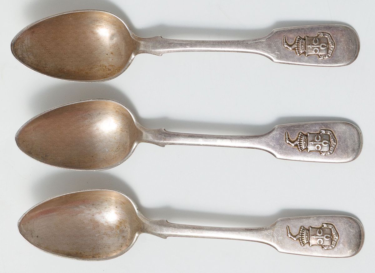 Srebro, pr. 12, stal (ostrza noży), waga bez noży 846 g; w składzie po 6 łyżek 23 cm, widelców 22 cm, noży 26 cm, razem 18 sztuk