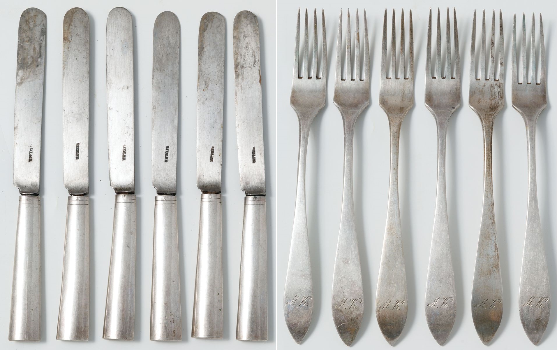 Po 6 noży i widelców, srebro, stal (ostrza nozy), waga widelców 259 g, dł. 21,5 i 25 cm