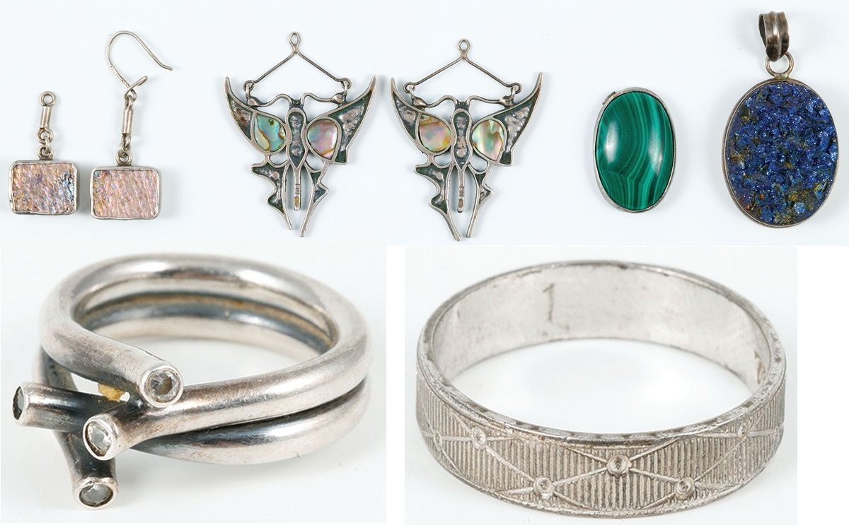 Dwa pierścionki, trzy wisiorki, para kolczyków (jeden bez zawieszki), oprawiony kamień; Srebro, malachit, tytan, cyrkonie, masa perłowa, waga cłk. 40 g