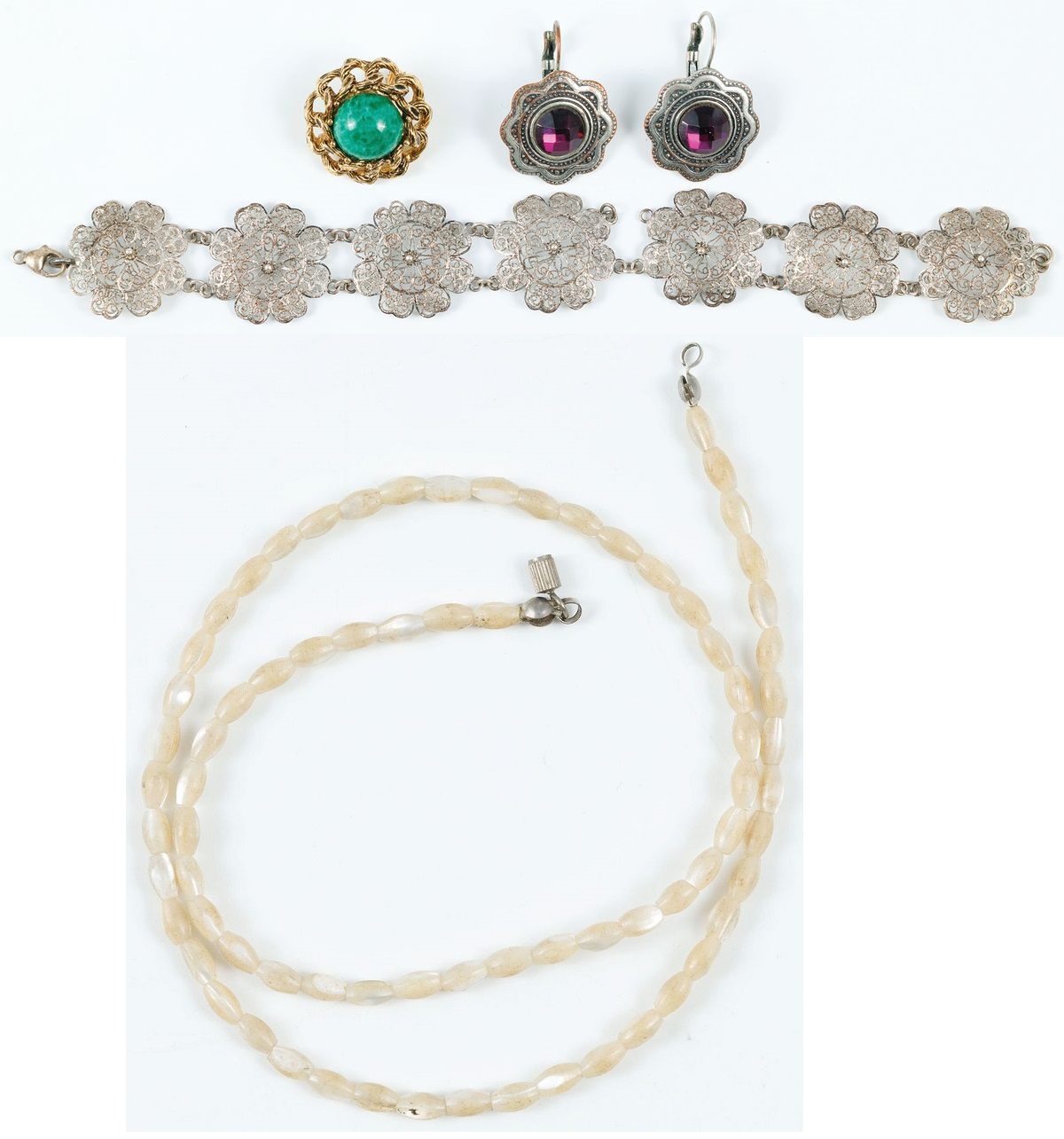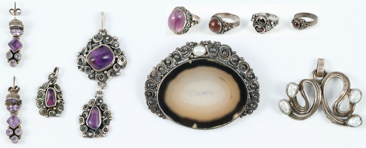 Cztery pierścionki, broszka, trzy wisiorki, para kolczyków; srebro, pr 1-3; ametysty, perły, agaty, waga cłk. 62,3 g