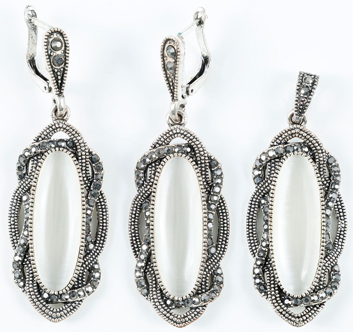 Para kolczyków i wisiorek, srebro, pr. 925, kamień księżycowy, markazyty, waga cłk. 25,7 g, dł. 60 mm