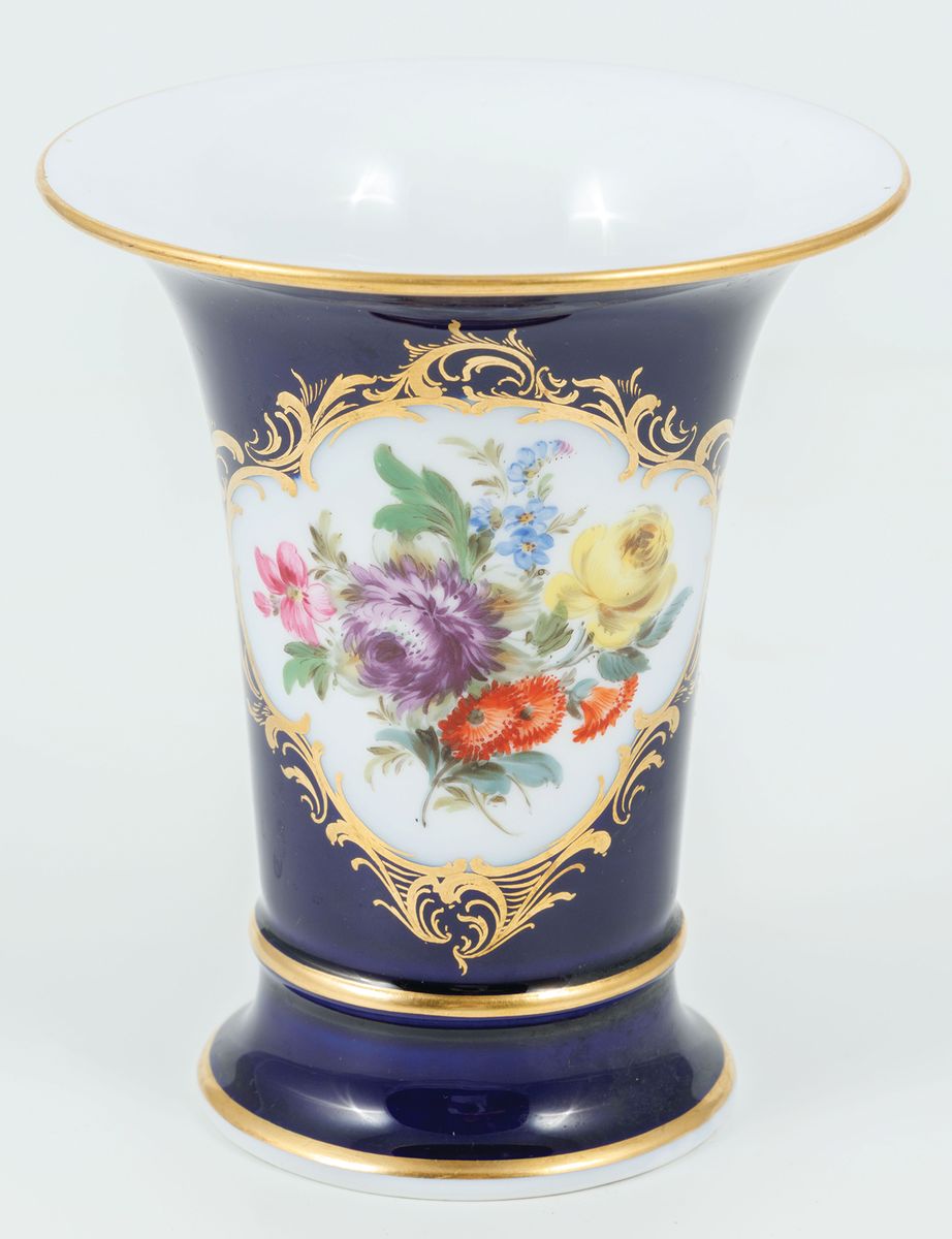 Porcelana, kobalt podszkliwny, farby naszkliwne, złocenie, wys. 13,5 cm
