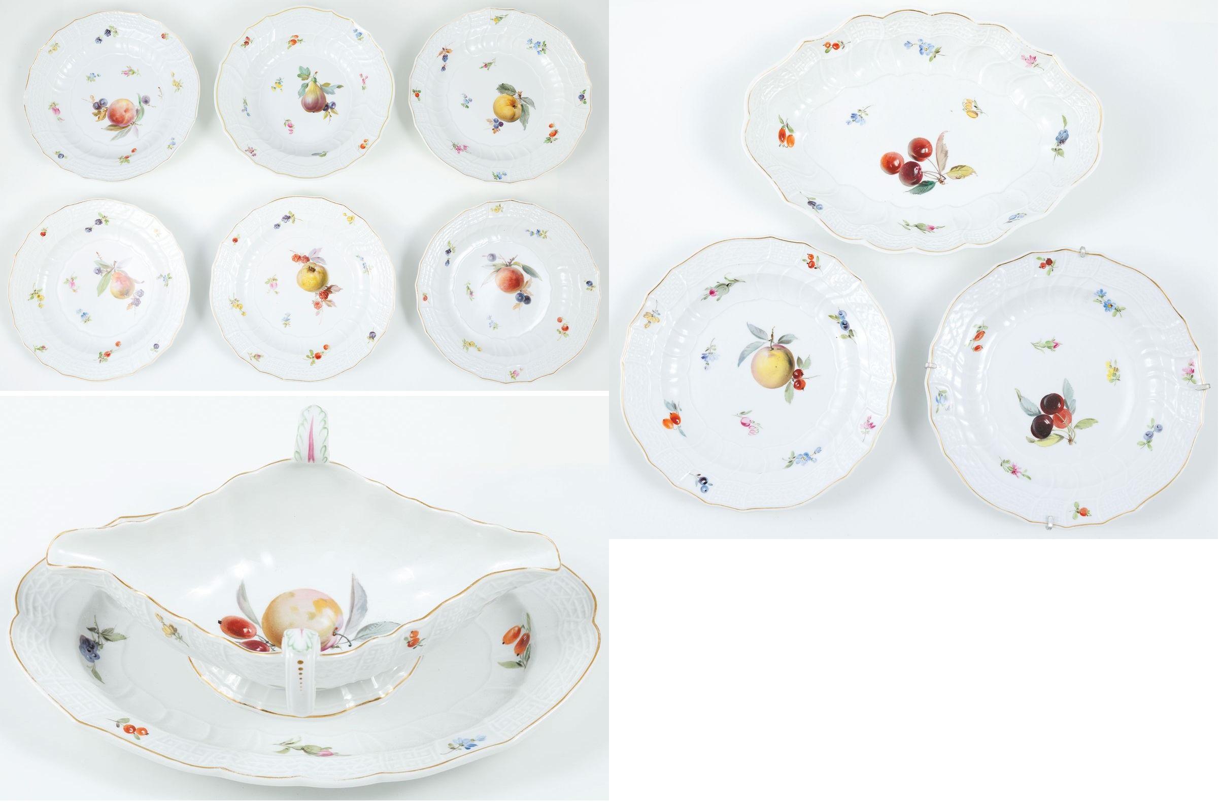 Porcelana, farby naszkliwne, złocenie wz. neuosier; w składzie 5 talerzy głębokich, śr. 24,7 cm, (jeden ze szczerbami), sosjerka 27 cm, półmisek kolisty śr. 24 cm, półmisek podłużny 26 cm, dwa talerze śr. 20 cm (jeden...