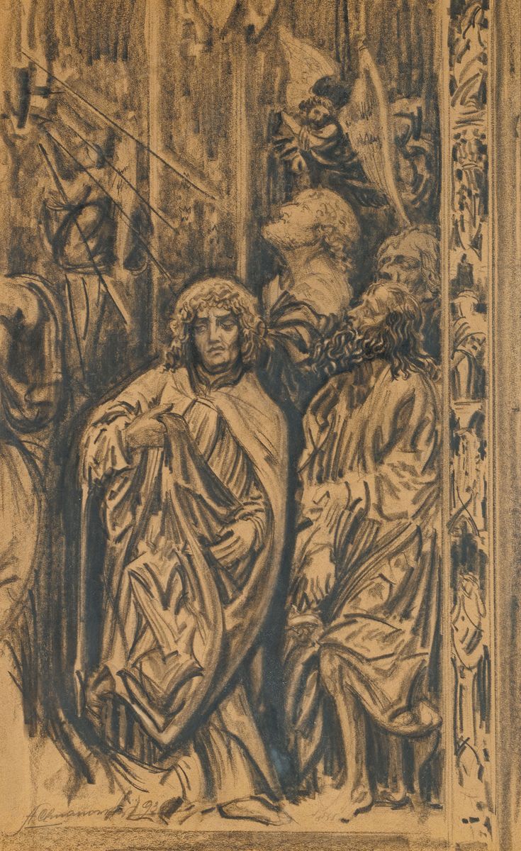Czarna kredka, ołówek, papier bezowy; 50,5 x 31,5 cm (w świetle p-p)