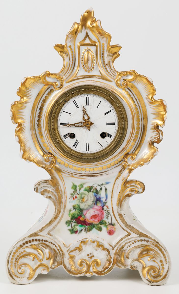 Obudowa porcelana, farby naszkliwne, złocenia, wys. 35 cm, tarcza emaliowana, mechanizm o naciągu sprężynowym z regulatorem wahadłowym, bicie godzin i półgodzin; sygnowany na tylne płycie mechanizmie: B & C / Paris; 3292
