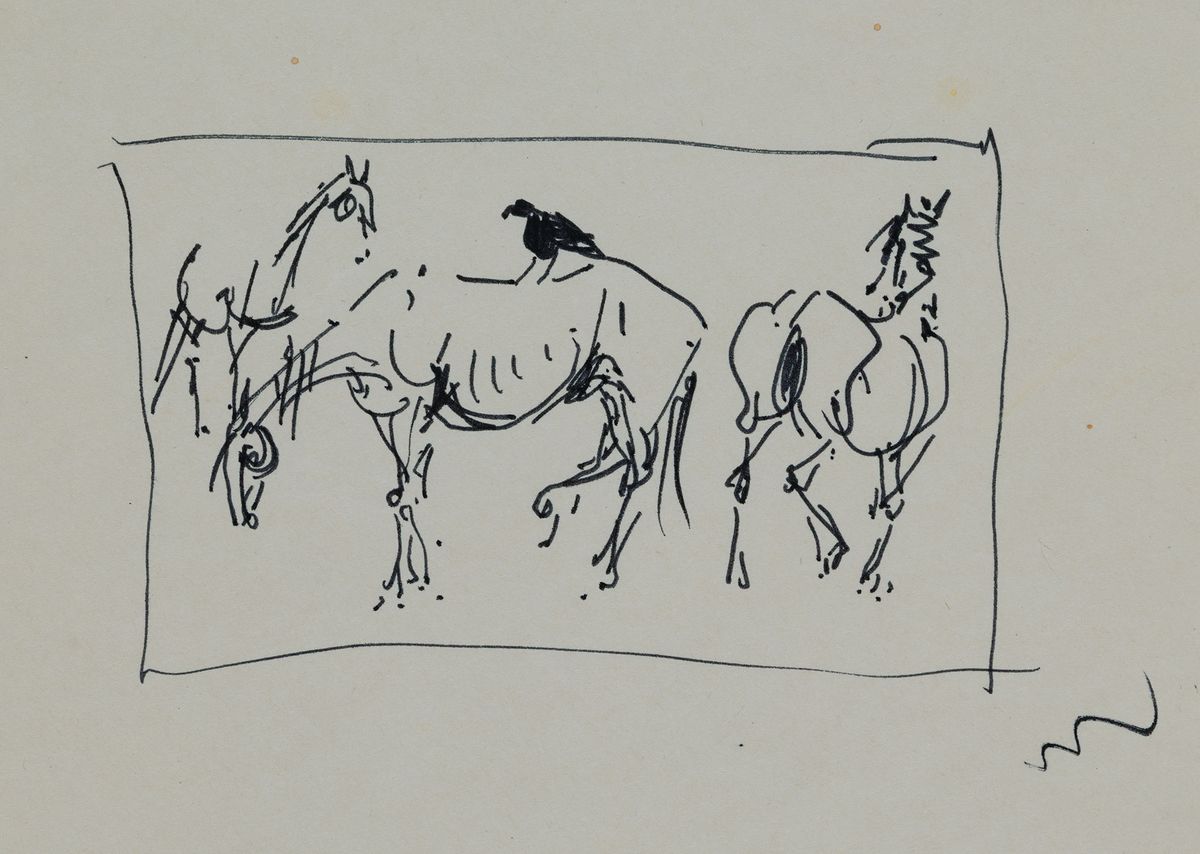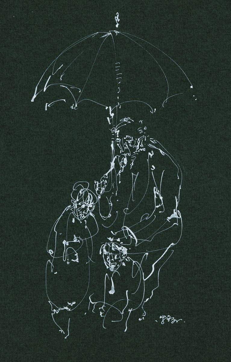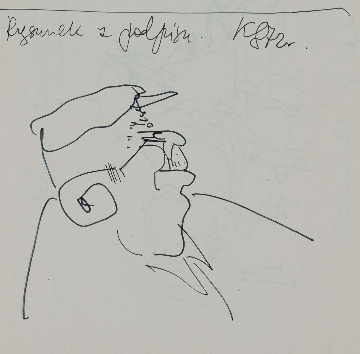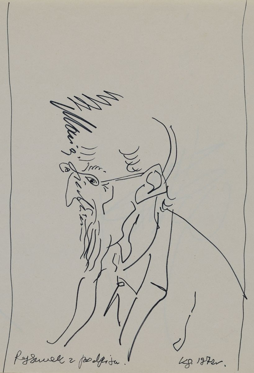 2 – biały tusz, piórko na barwnym papierze, jeden za zielonym sygnowany KS73, drugi na brązowym: 7 III / 1973 / Panu Andrzejowi, który mi o mały włos ręki nie złamał...