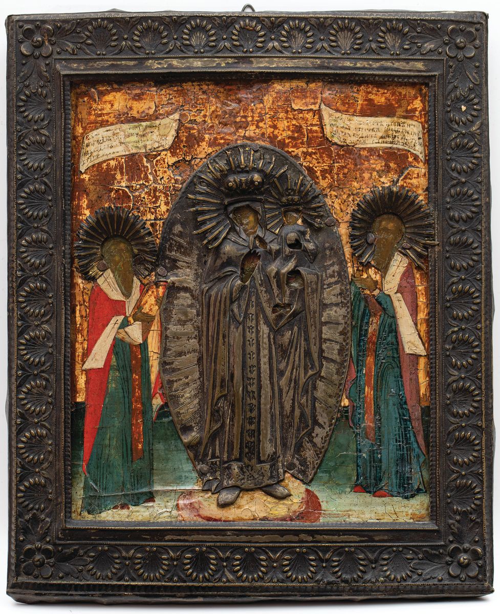 Tempera, deska, basma i suknia i wieńce mosiężne, srebrzone; 31 x 26 cm
