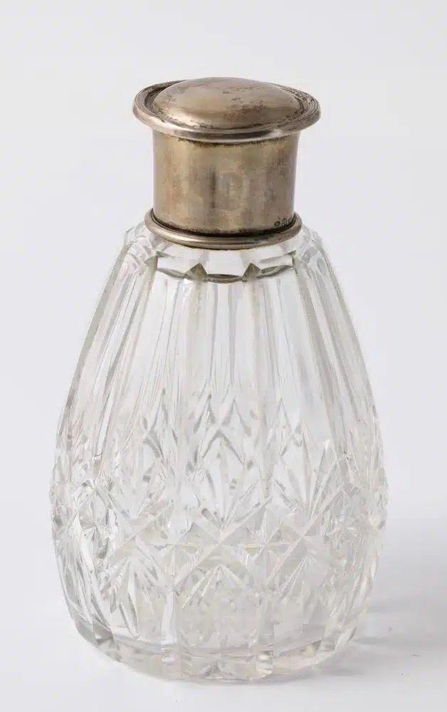 Szkło szlifowane, oprawa srebrna, próba 800; wys. całk. 13,5 cm