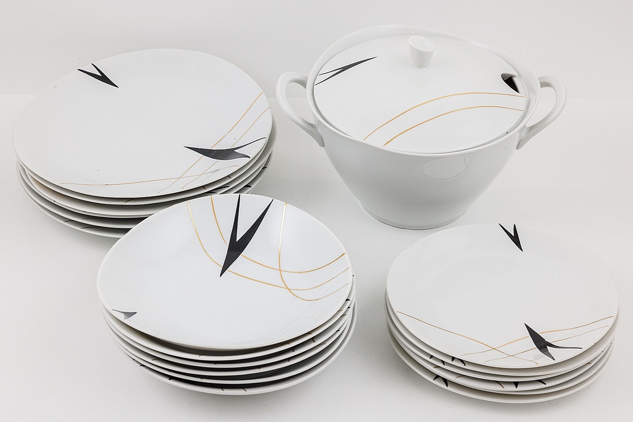 Porcelana, złocenie, czarna farba naszkliwna; w składzie waza (wys. 19 cm), po 6 talerzy płaskich 25 cm, głębokich 21 cm, talerzyków 19,5 cm