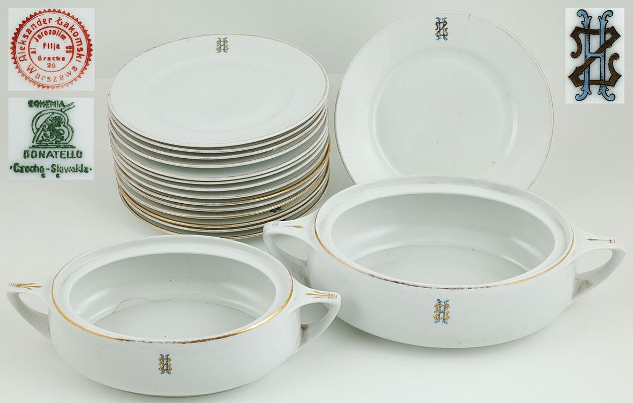 Porcelana, złocenie, złoto-niebieski monogram HZ, 15 talerzy płaskich śr. 25 cm, dwie wazy 33 i 37 cm