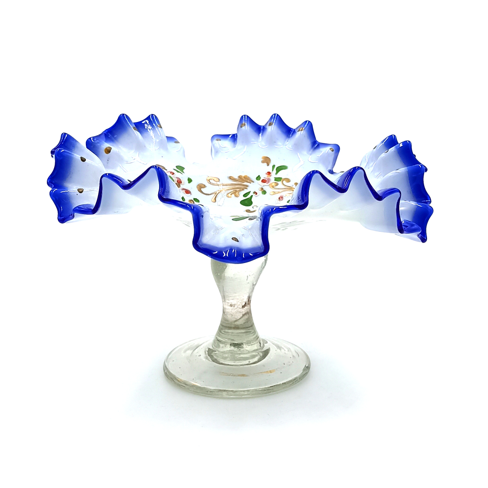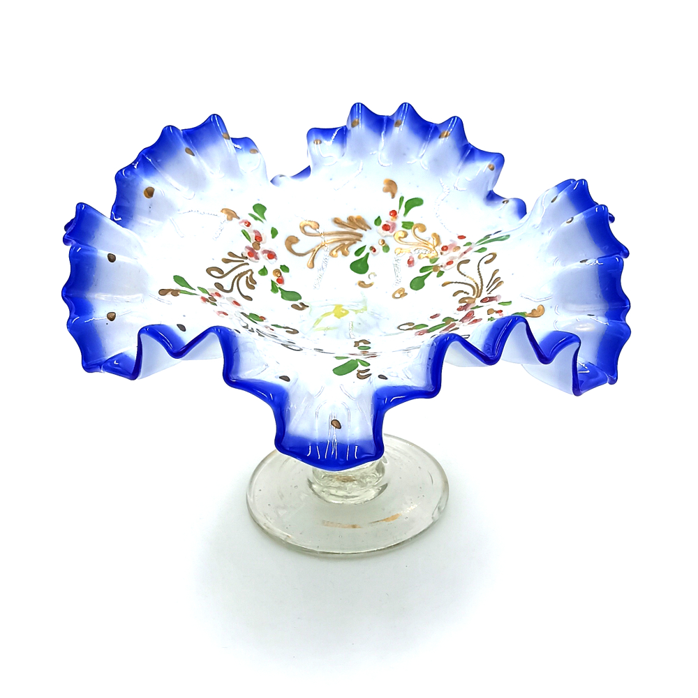 szkło mleczne, barwione częściowo w masie, malowane, wys. 14 cm