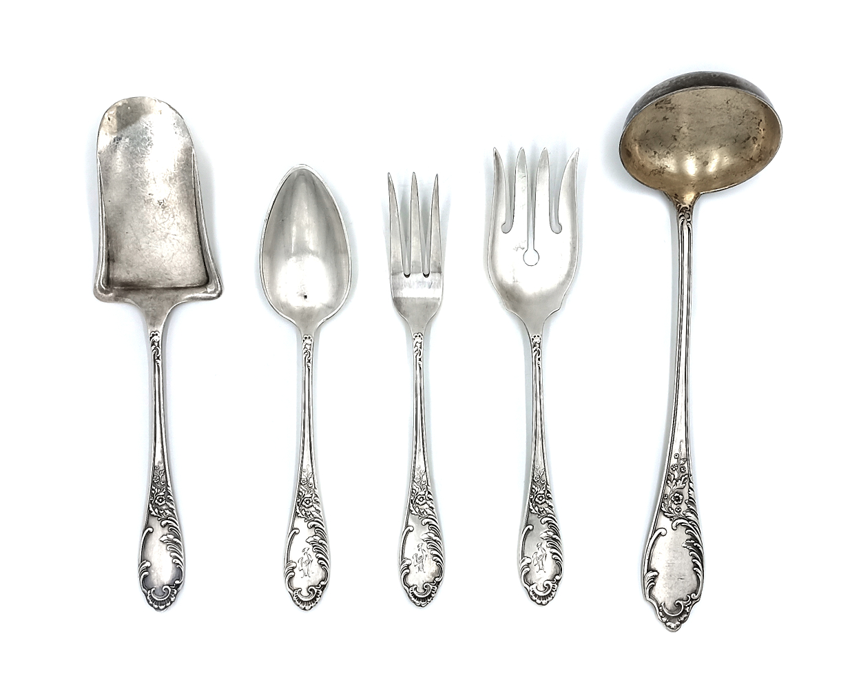 plater, złocenie, łyżka wazowa dł. 33, łopatka do ciasta dł. 30, łyżka półmiskowa dł. 26,6, dwa widelce półmiskowe dł. 25 i 26,5 cm