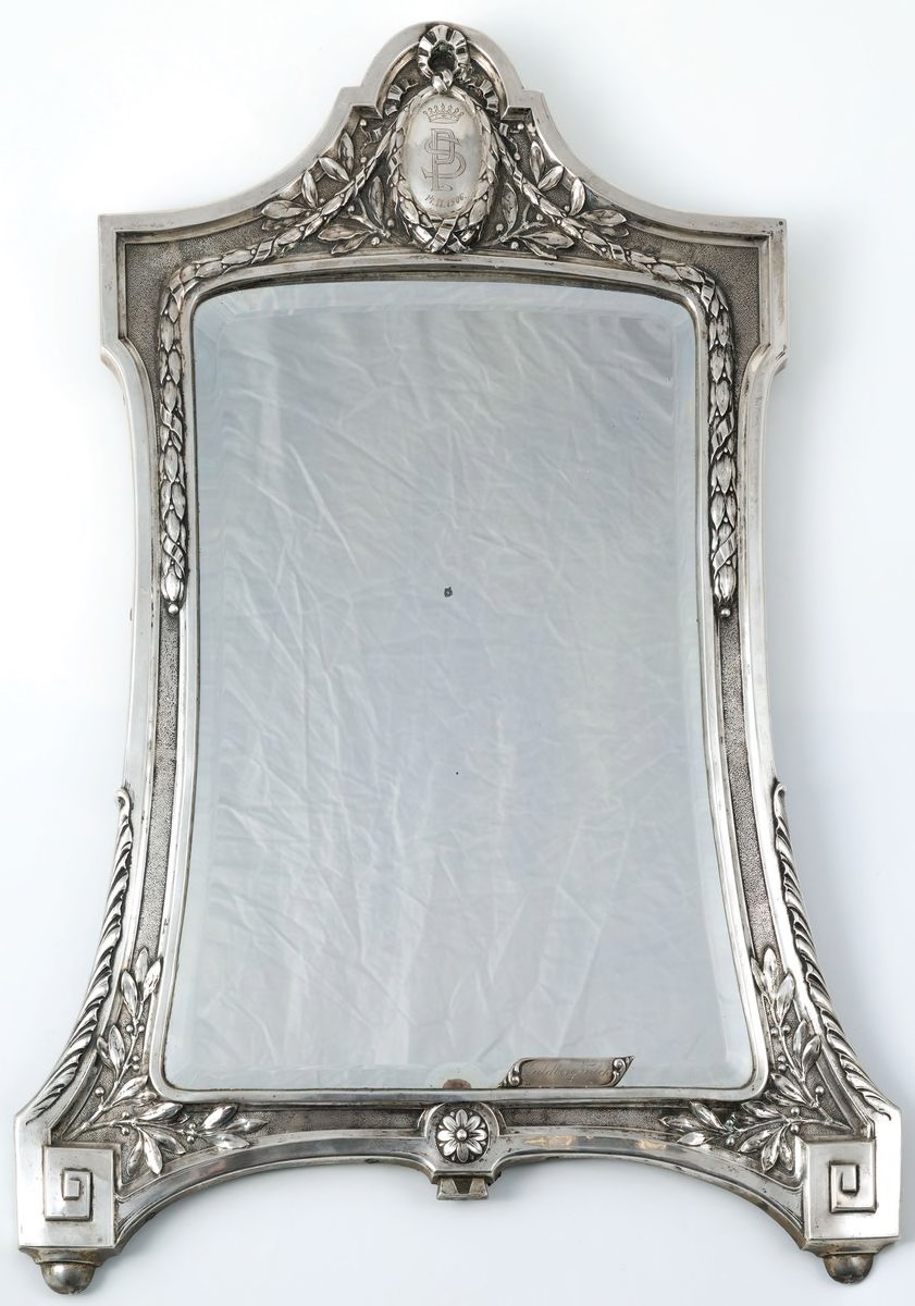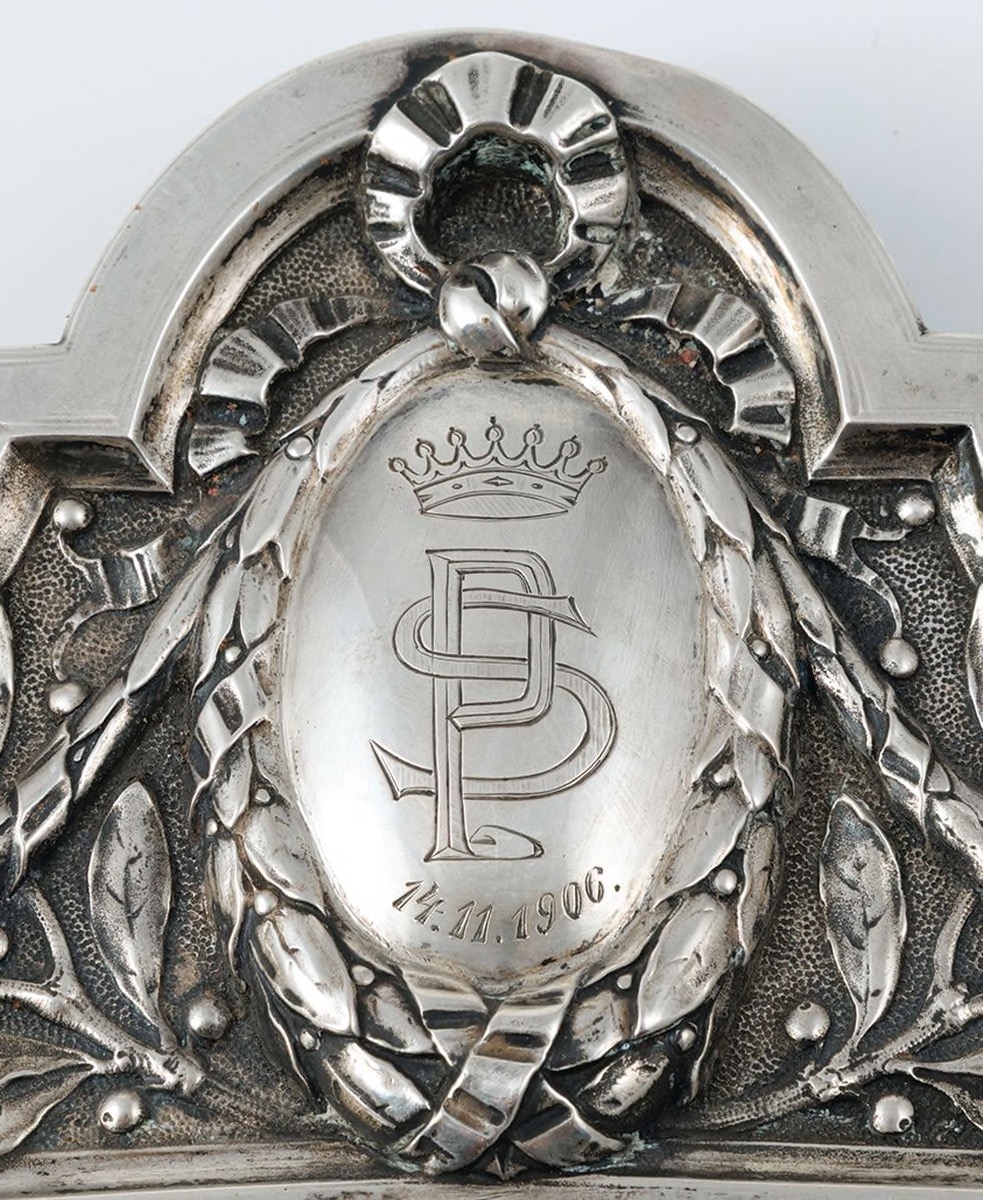 Oprawa srebrna, pr. 800, szkło, plecy drewniane z rozkładaną podpórką; 59 x 43,5 cm