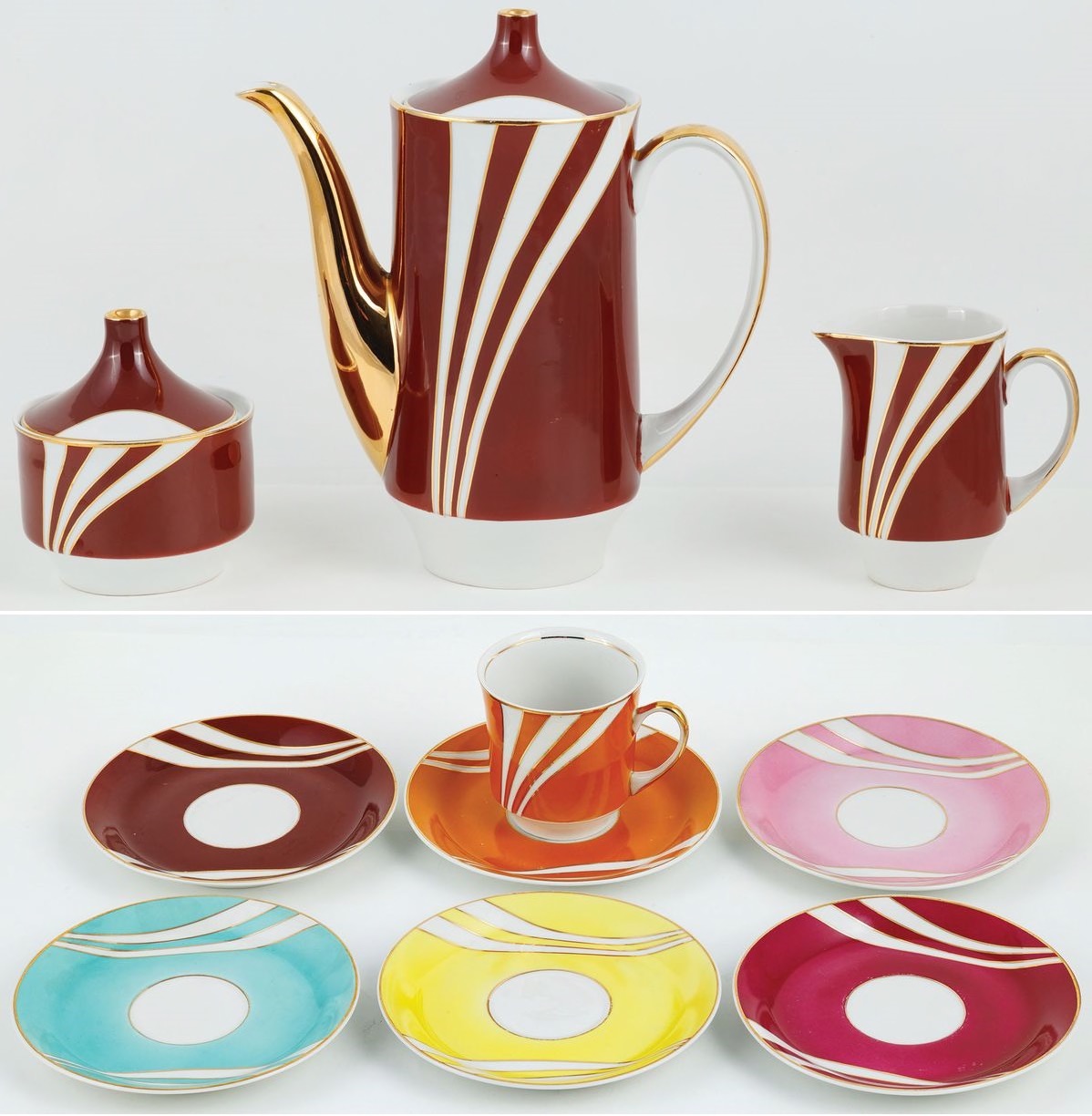 Dzbanek do kawy 22c, mlecznik 10 cm, cukiernica 11 cm, filiżanka 8 cm, 6 spodków śr. 15 cm