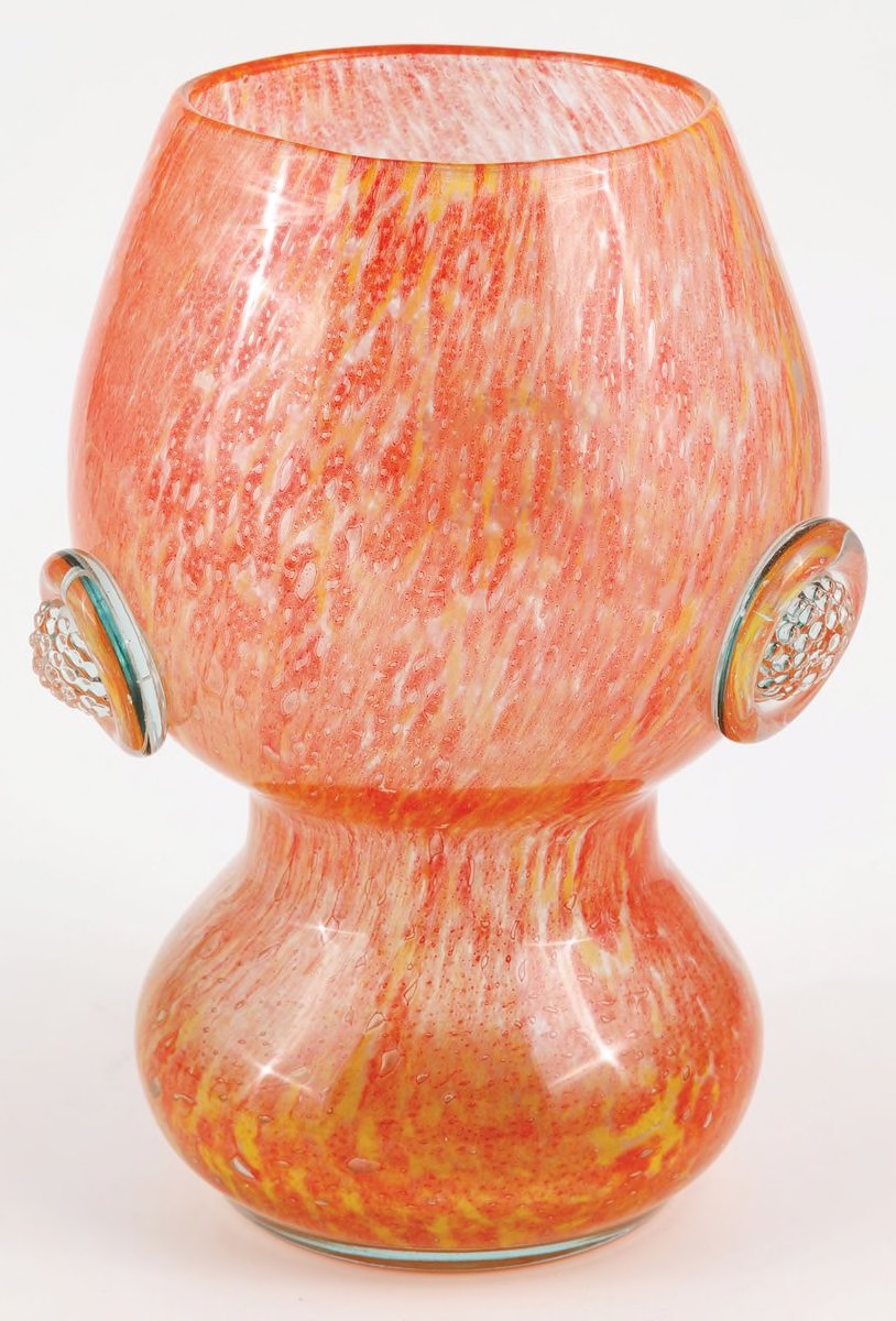 Szkło sodowe, antico, wolnoformowane, nakrapiane czerwonym i żółtym, aplikacje, wys. 22 cm