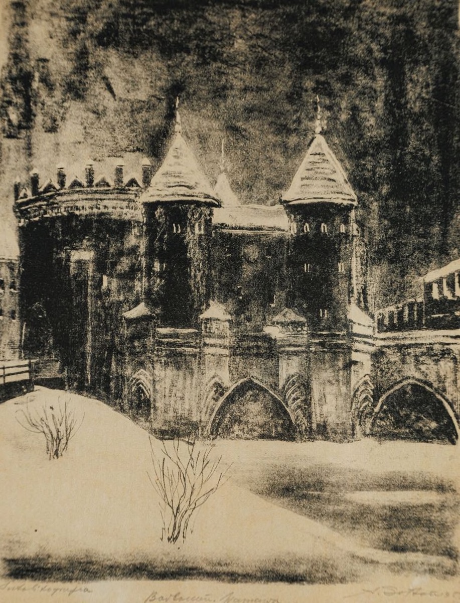 Sygnowany ołówkiem pod rycina: Autolitografia Barbakan Warszawa A. Sołtan