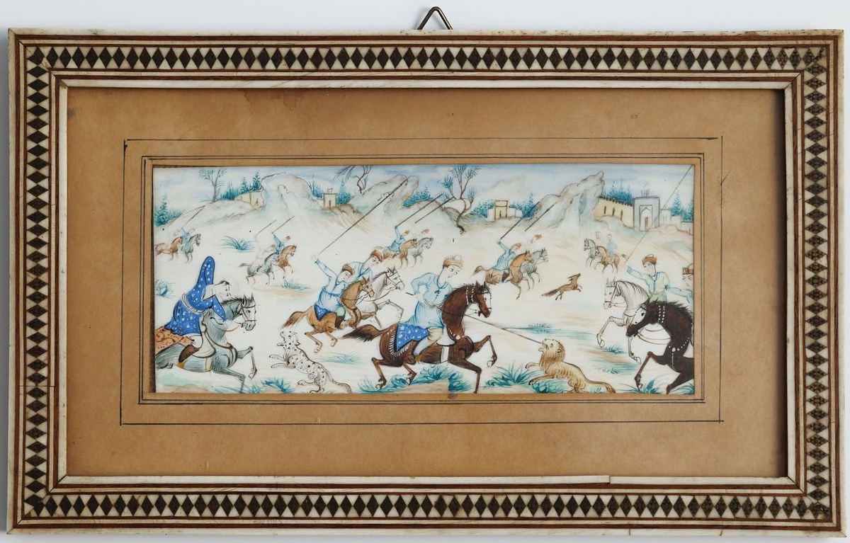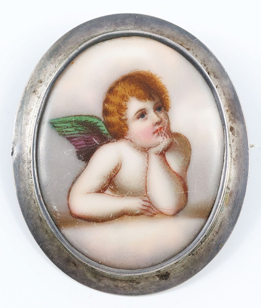 Porcelana, farby naszkliwne, oprawa srebro, 50 x 40 mm