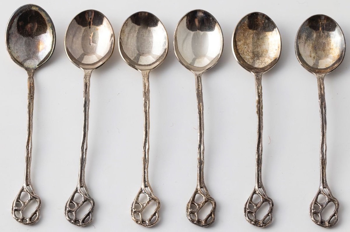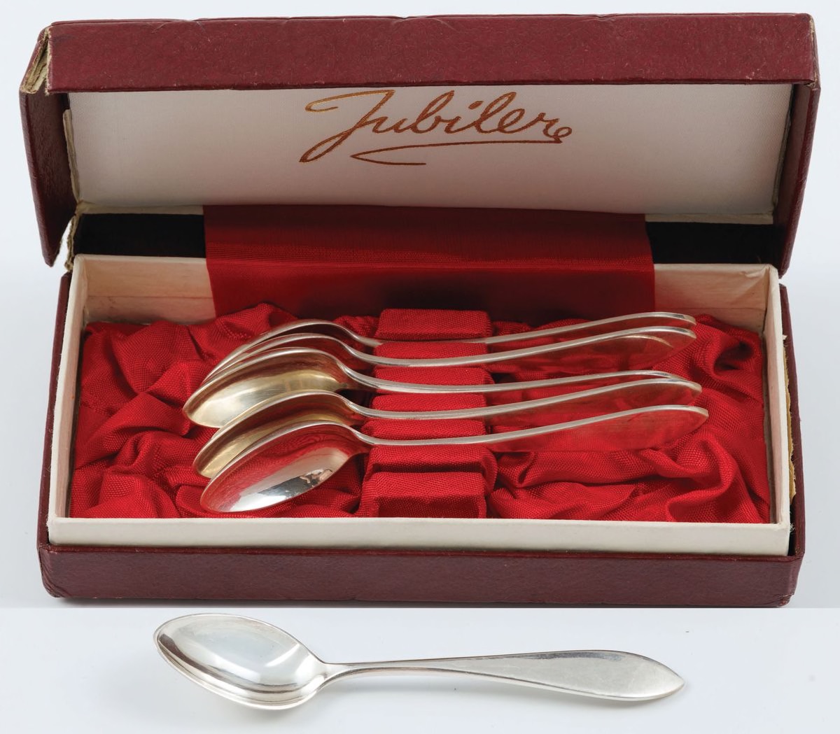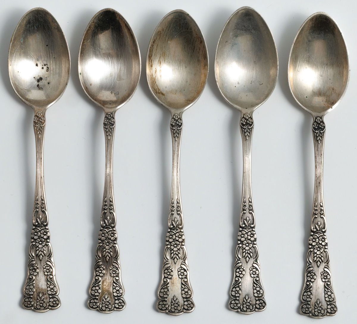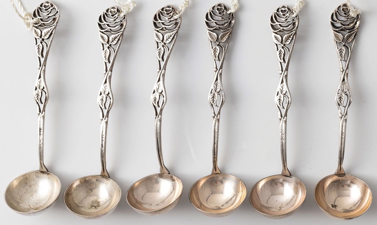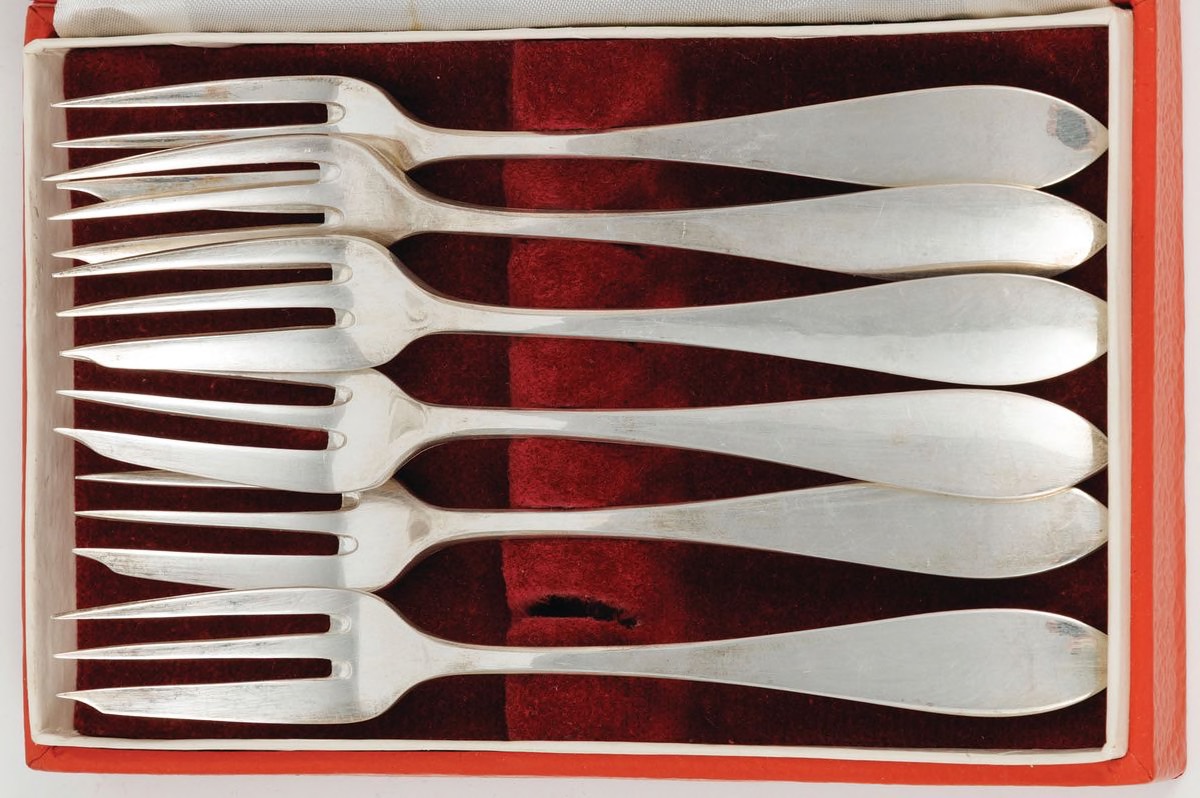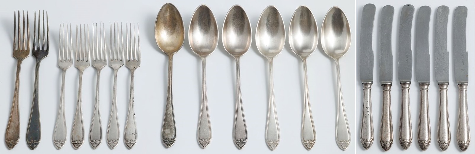 Plater na nowym srebrze, stal nierdzewna (ostrza noży), w składzie: 6 łyżek 21 cm, 2 widelce 20,5 cm, 5 widelców 18,5 cm, 6 noży 21 cm
