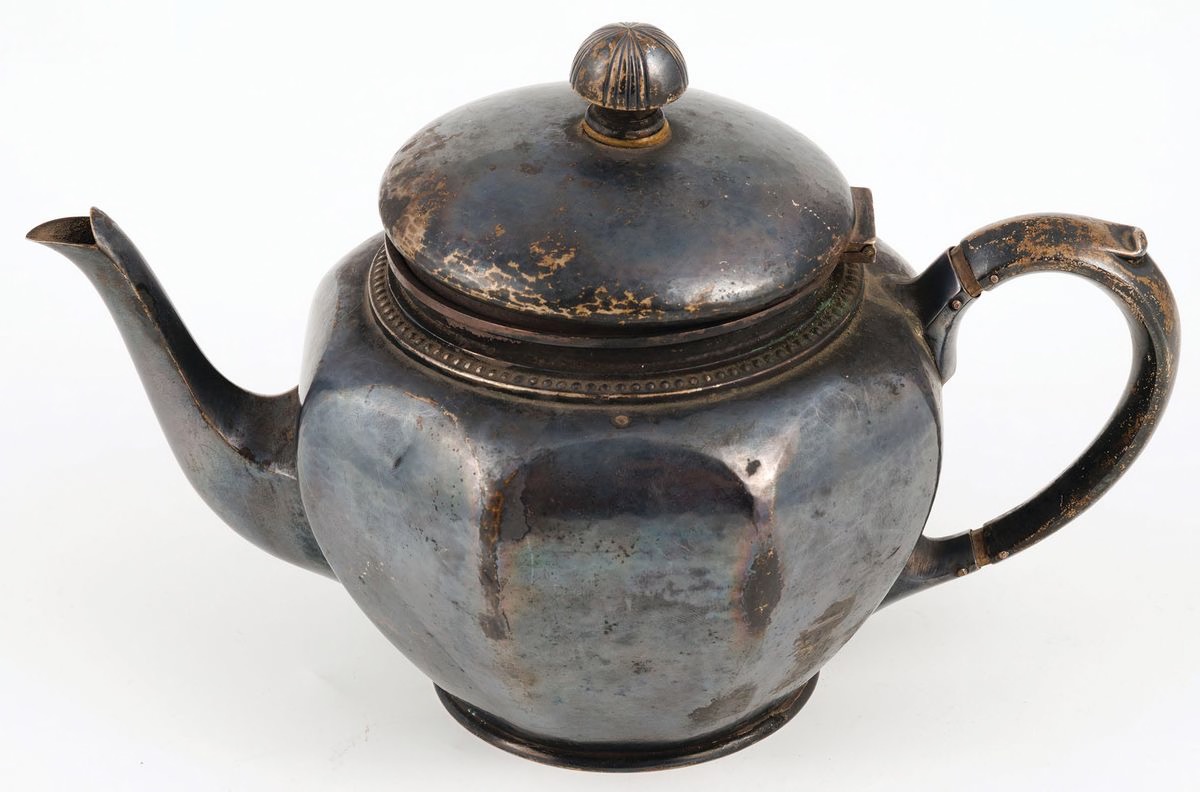 Dzbanek (22 cm, wylew wyszczerbiony, pokrywka pęknieta), 4 spodki, śr. 45 mm, dwa talerzyki śr. 17 cm, paterka dwudzielna 13 cm, półmisek śr. 32 cm