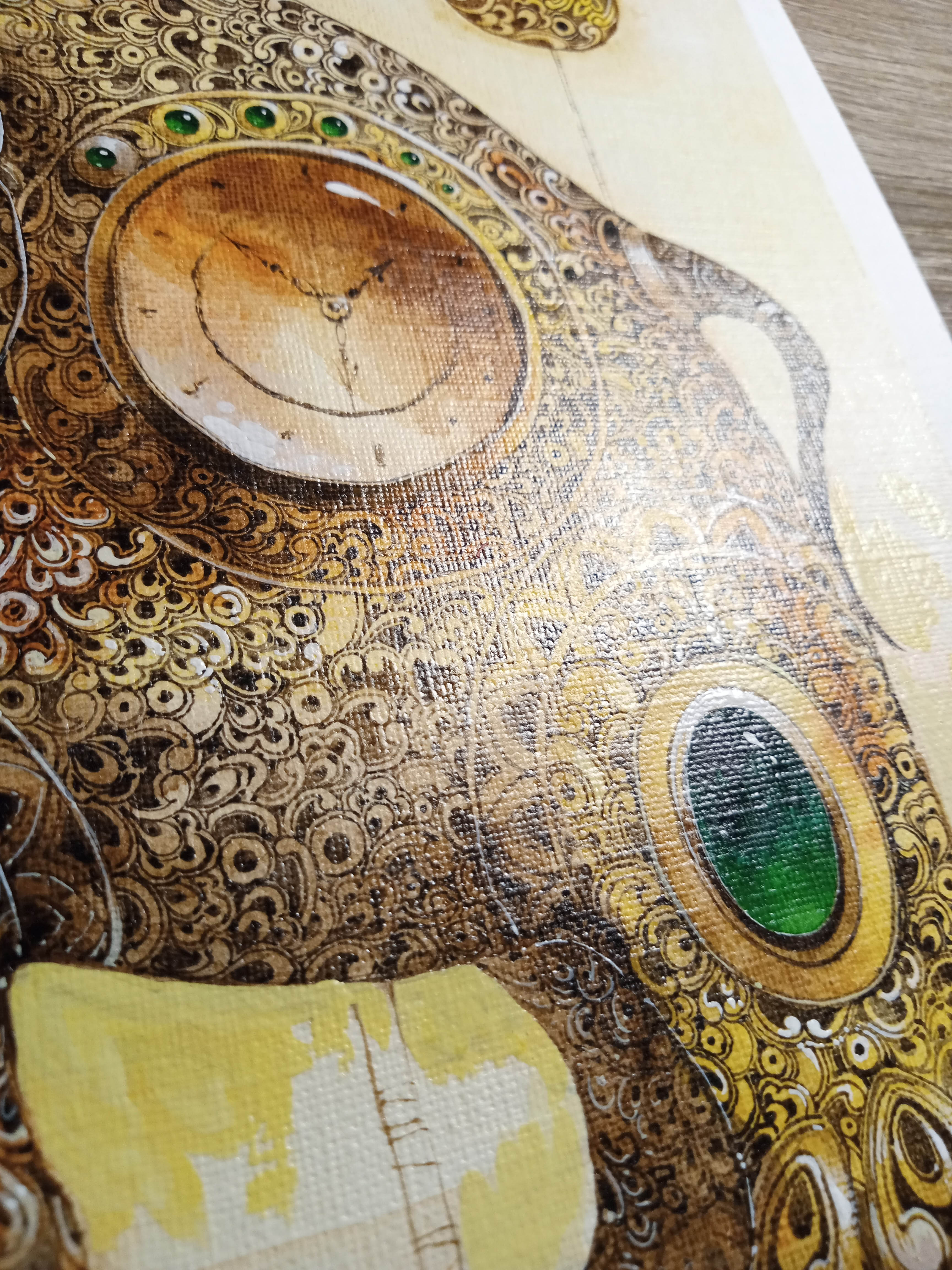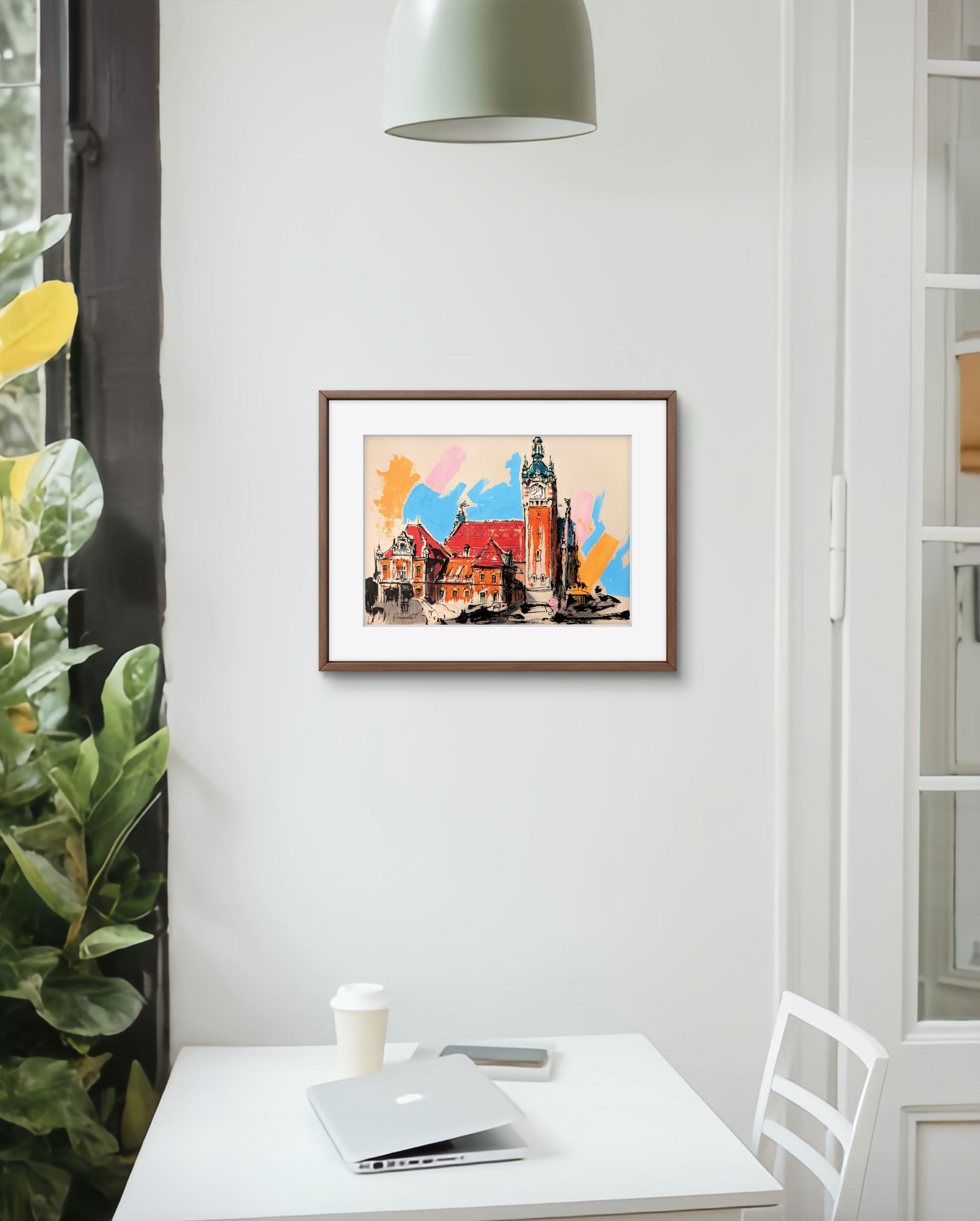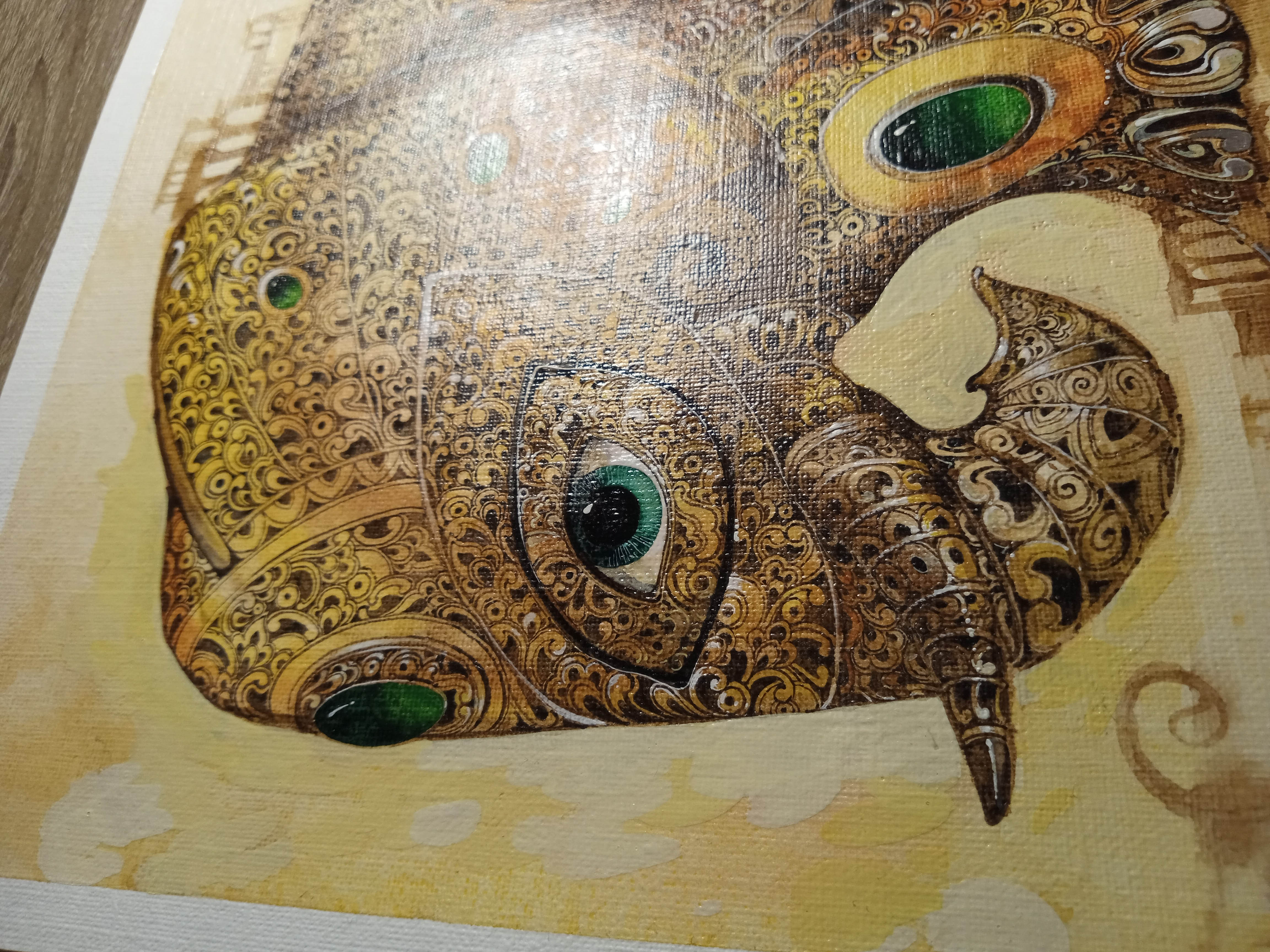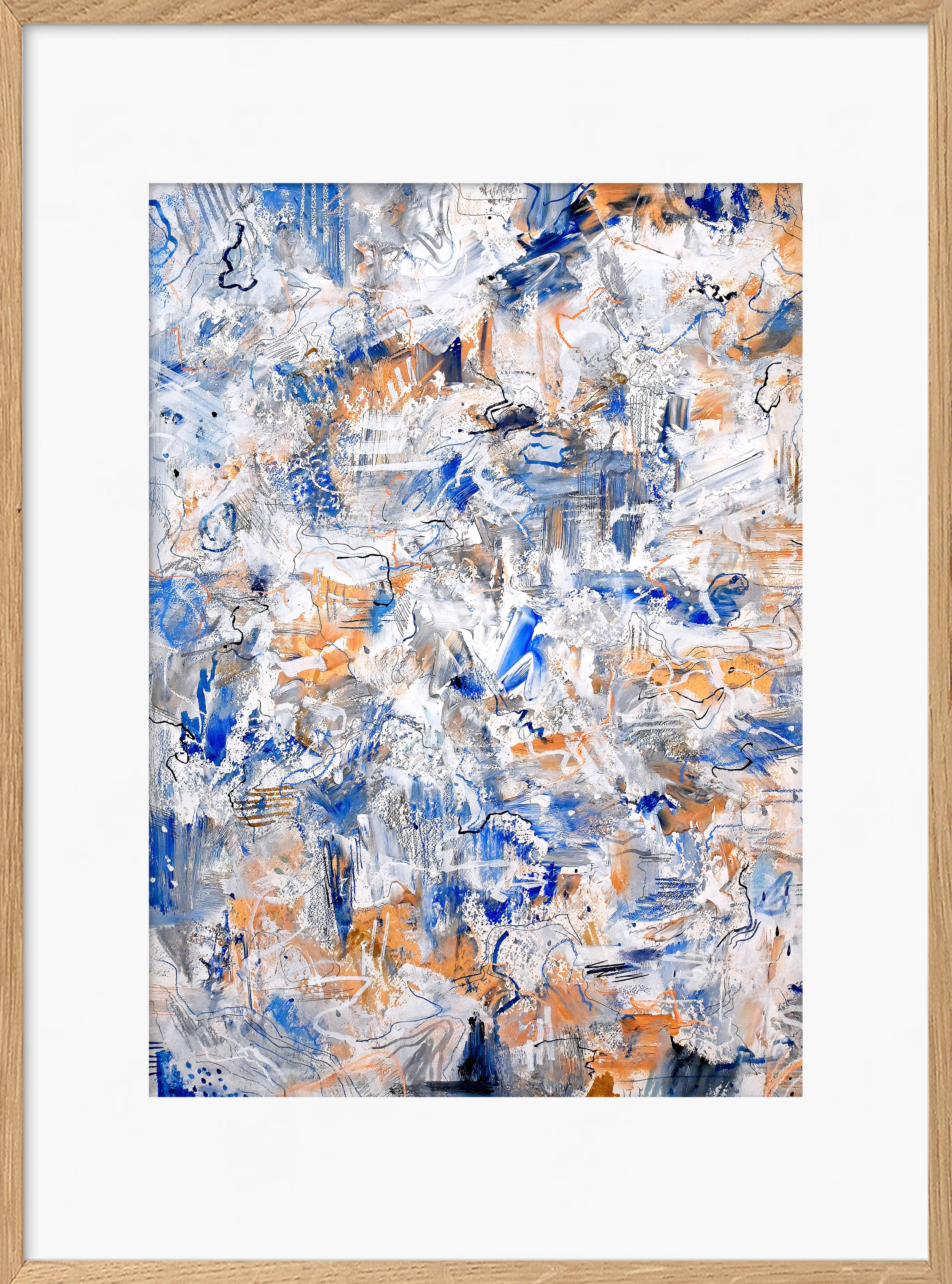 technika mieszana (akryl, tusz, pastel), papier akwarelowy Arches, 70 x 50 cm, w dębowej oprawie: 84 x 64 cm,