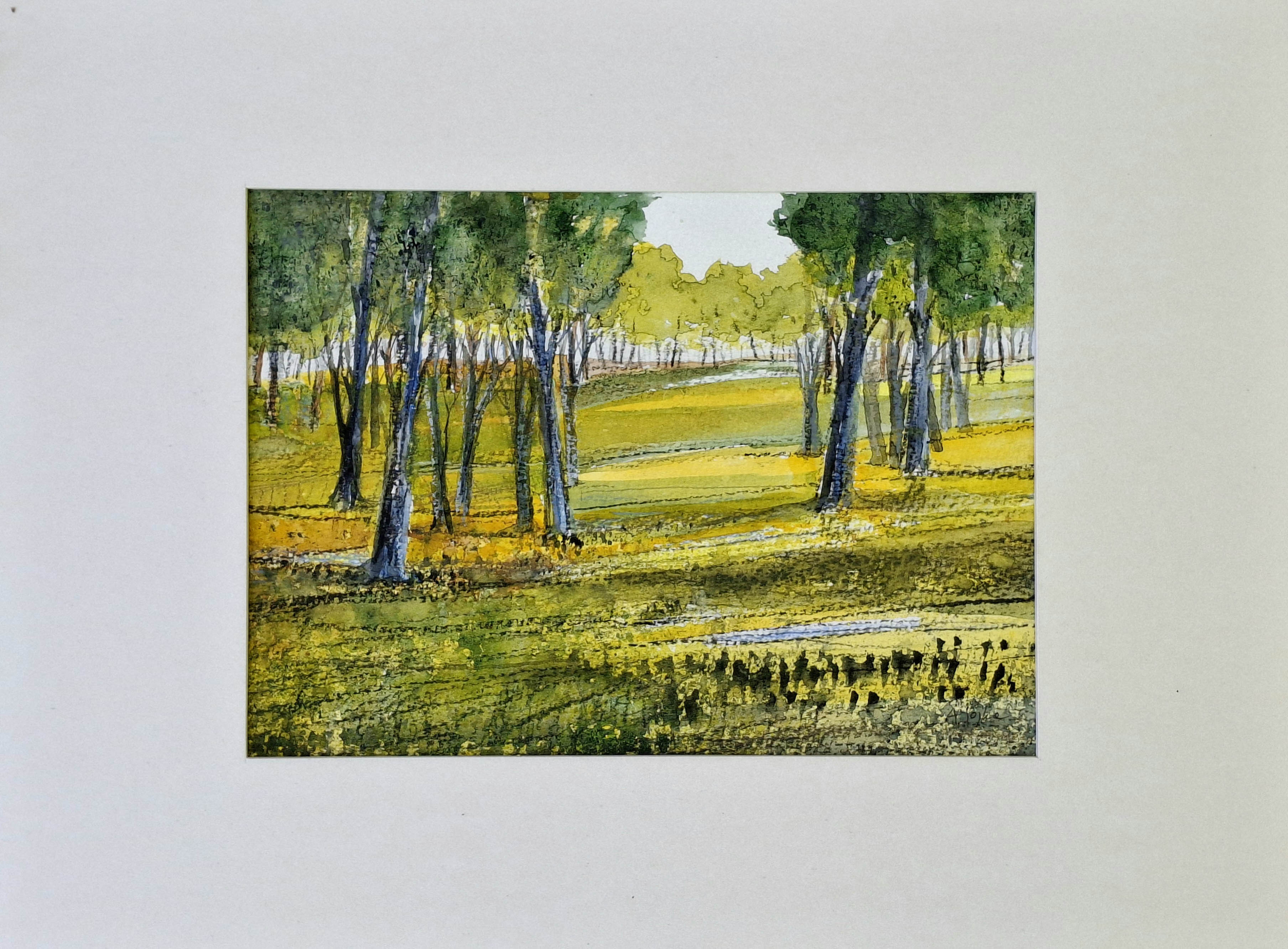 technika mieszana (akwarela, pastel olejna), papier akwarelowy, 19 x 26 cm (arkusz), w świetle passe-partout: 17,5 x 24,5 cm,