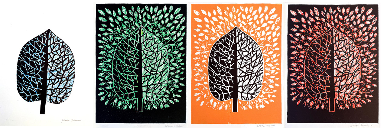 linoryt kolorowany, papier, 4 prace o wymiarach: 28 x 21 cm,