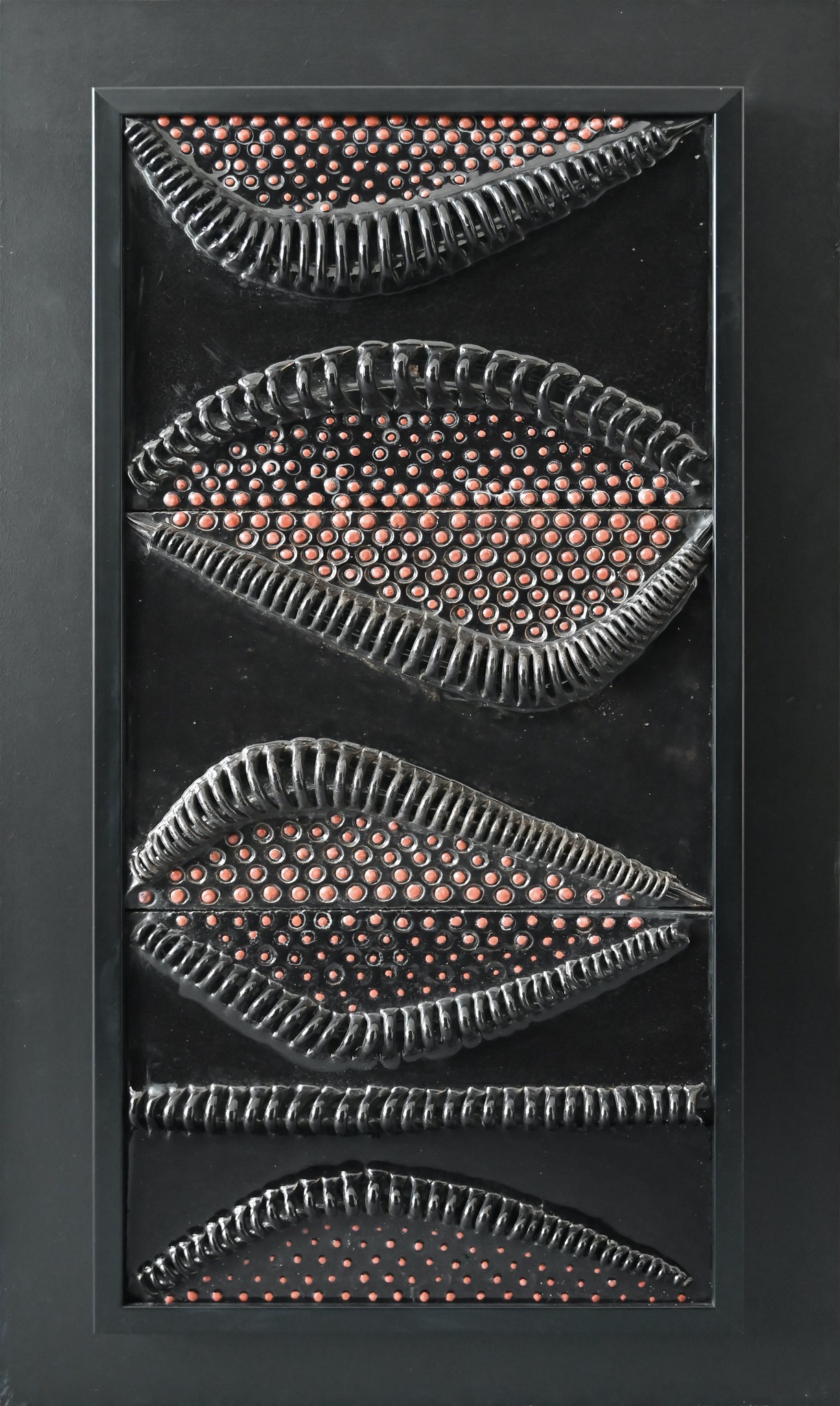 panneau ceramiczne, drewno; w oprawie: 102,5 x 57 cm, bez oprawy (3 kafle): 84,5 x 40 cm