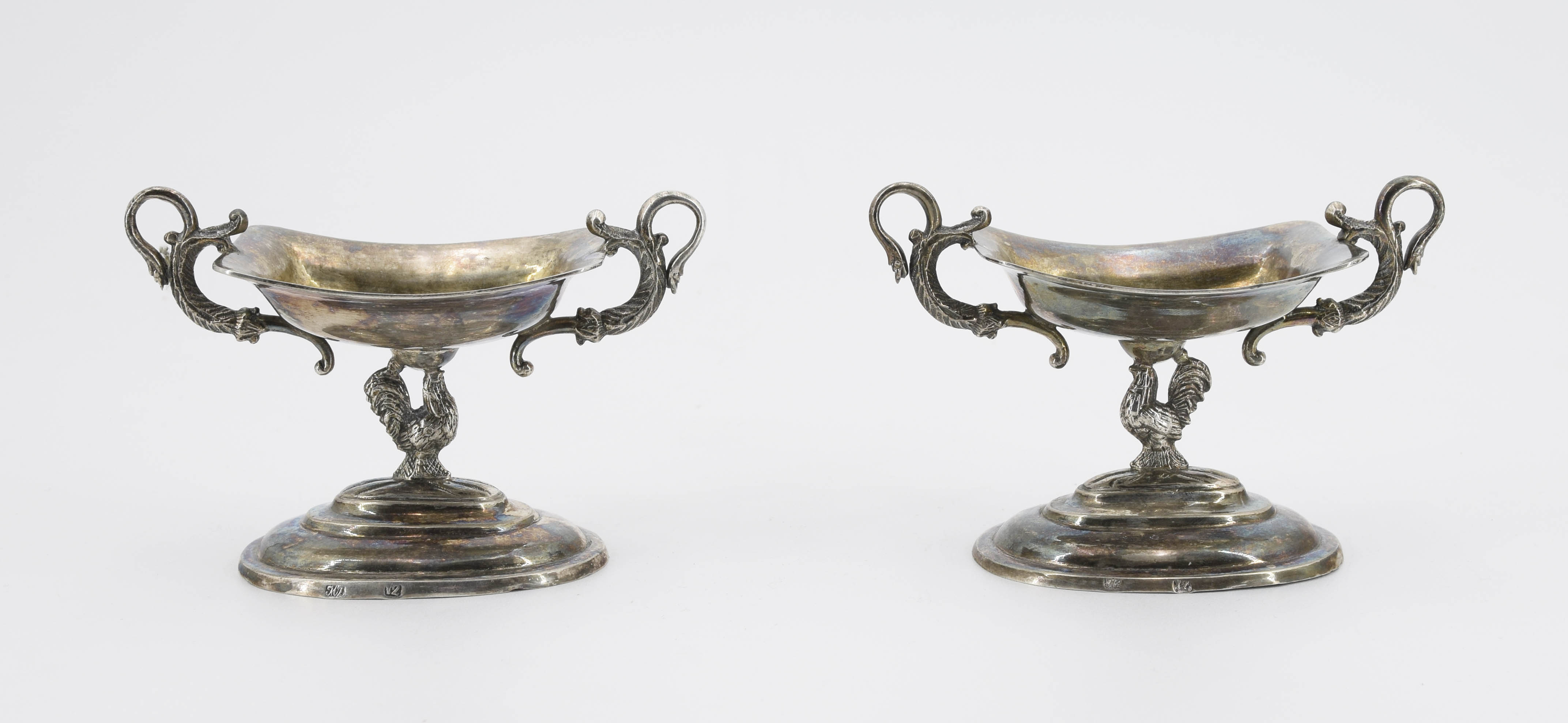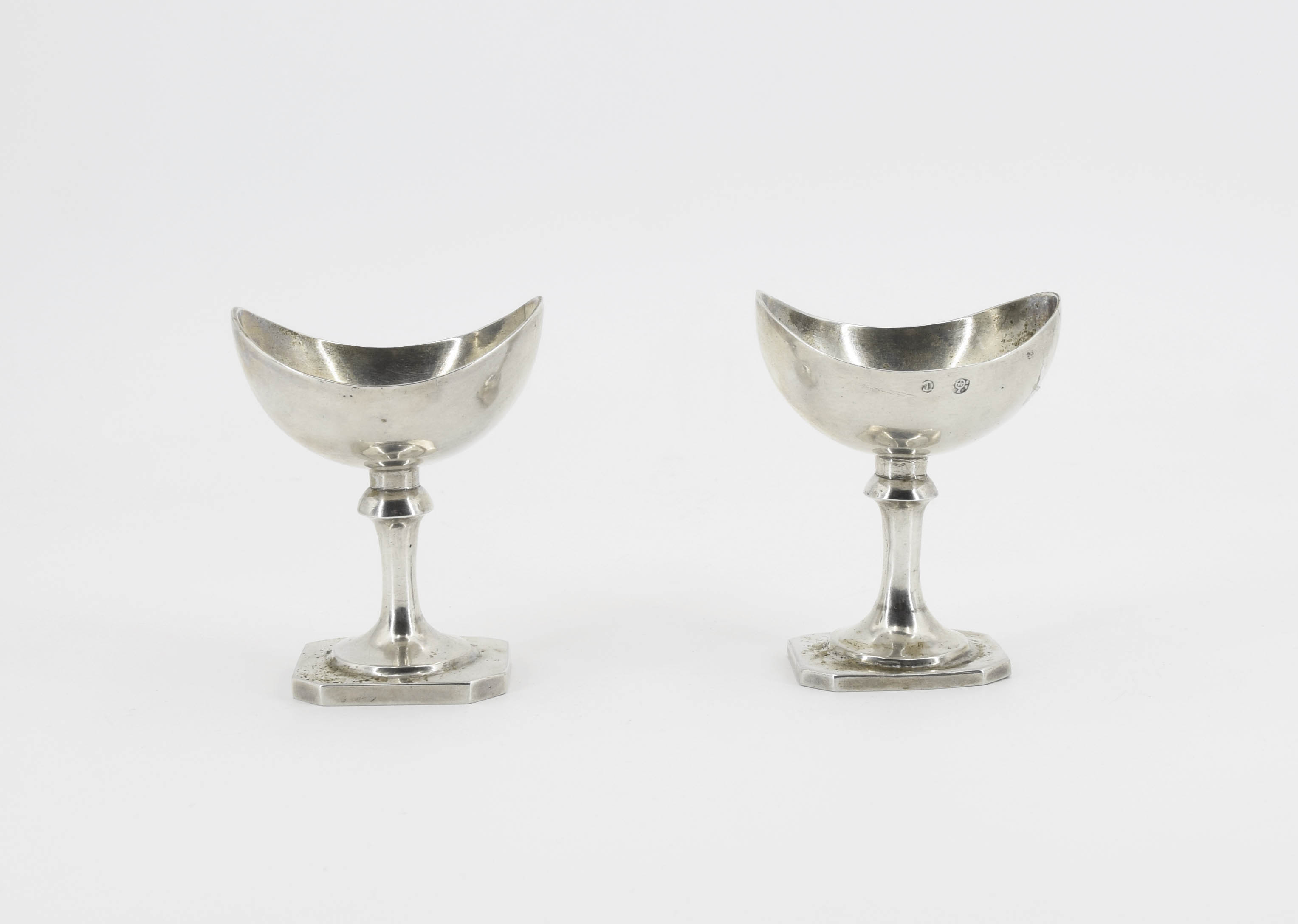 srebro próby 13 cechowane (cecha probierni austriackiej z próbą 13, literą F i rokiem niedobitym - 1825, monogram złotnika nieczytelny, na jednej solniczce tylko znak probierni); wys. 8,9 cm, szer. 7 cm, głęb. 6 cm; waga 148...
